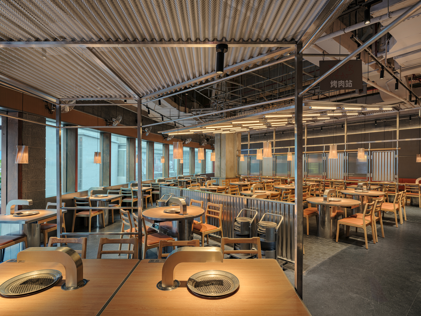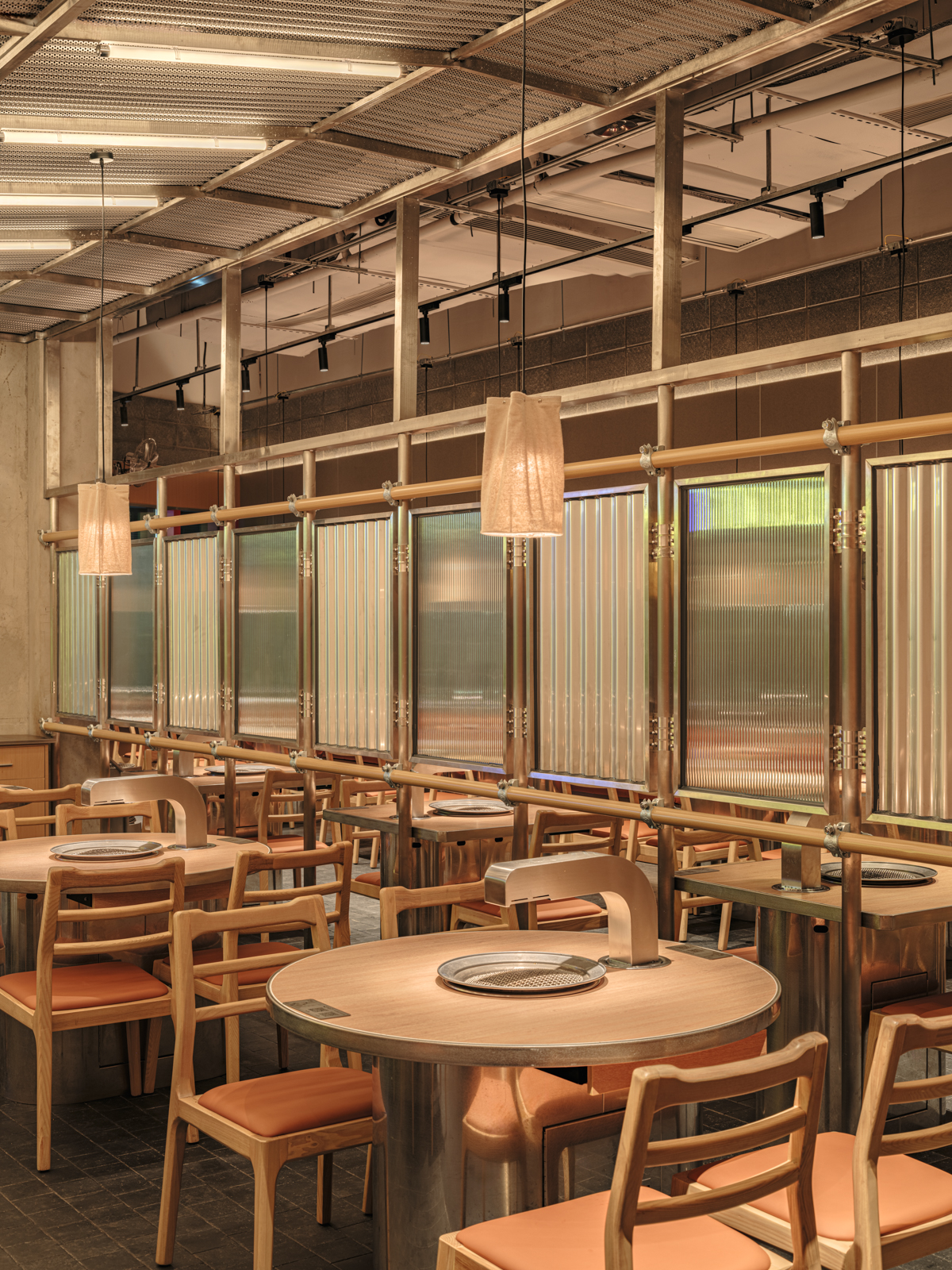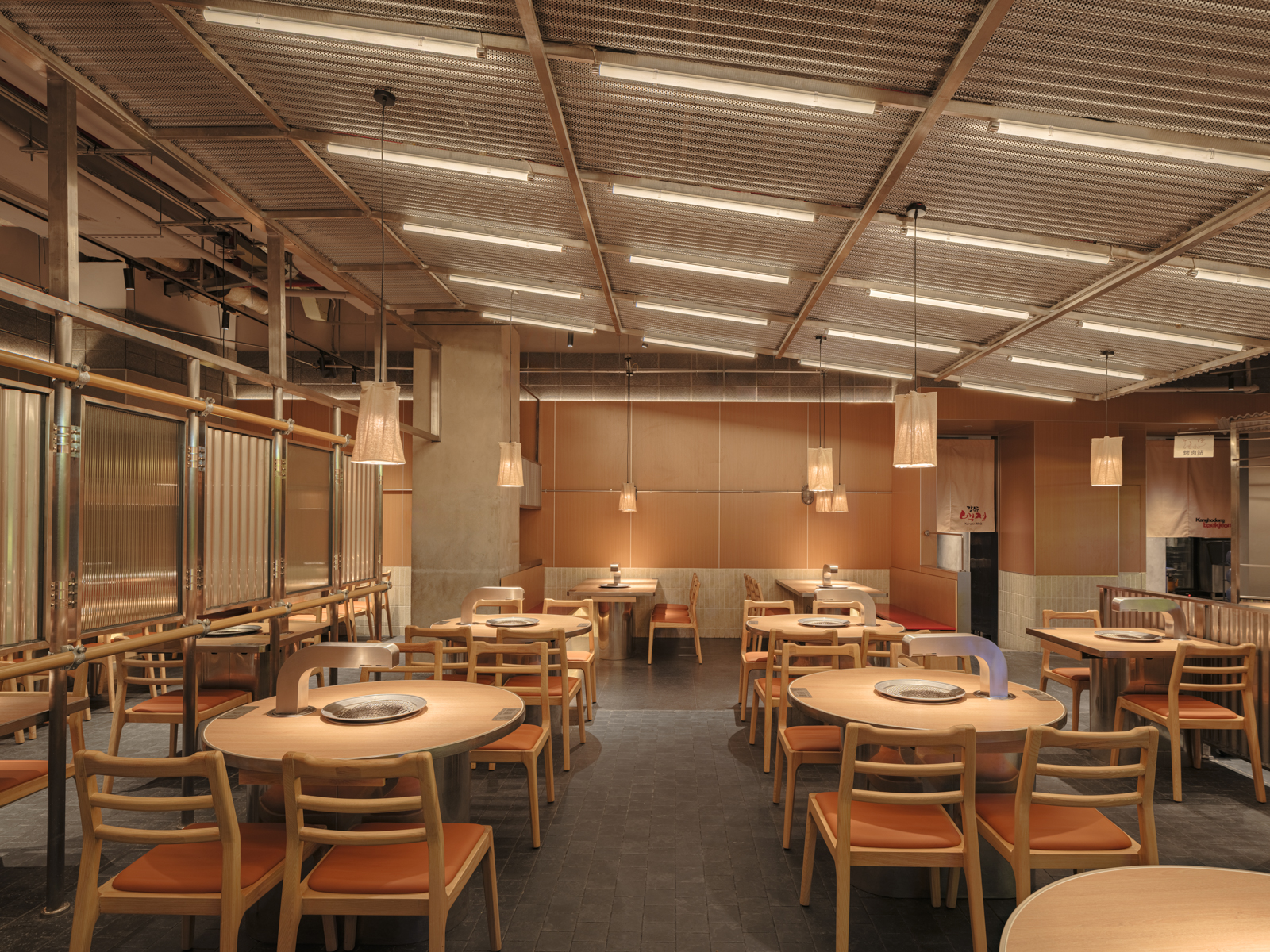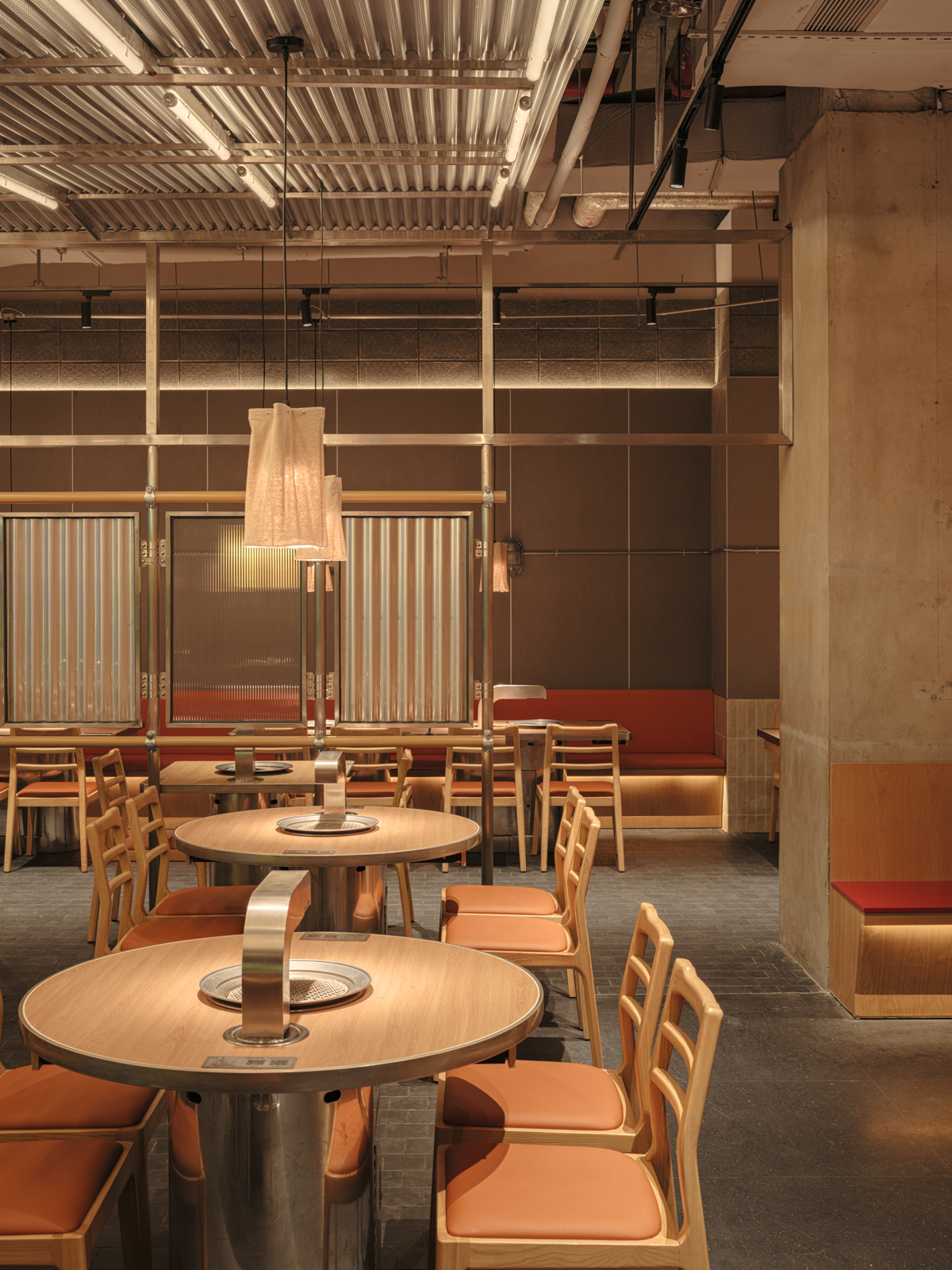 这次姜虎东烤肉的老店改造,并不是要把原来的状态推翻重来,而是顺着它原本的气质,把空间重新整理到一个更舒服的位置。设计从街头出发,借用人们早已习惯的空间逻辑:材料不必精致,结构可以被看见,很多东西就像是自然搭起来的。用餐被放回一种更开放、更接近城市日常的状态,像是在广场、街边,或临时搭起的棚子下面吃饭。