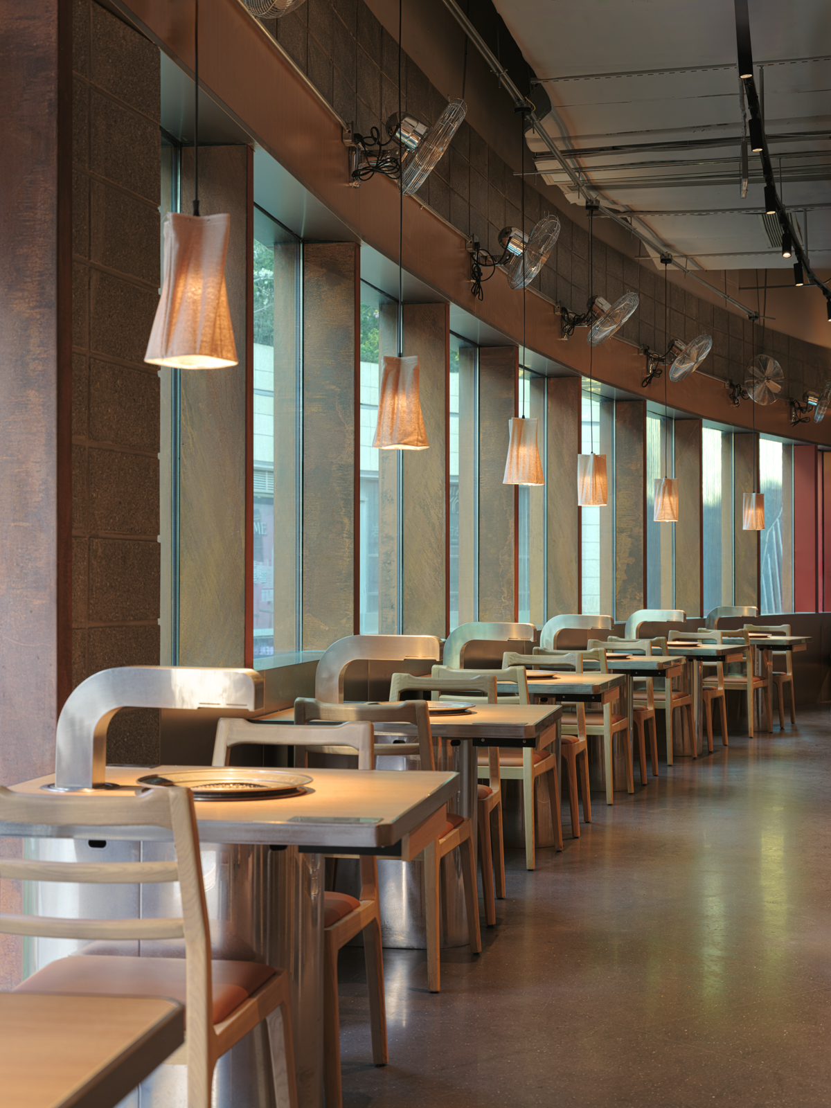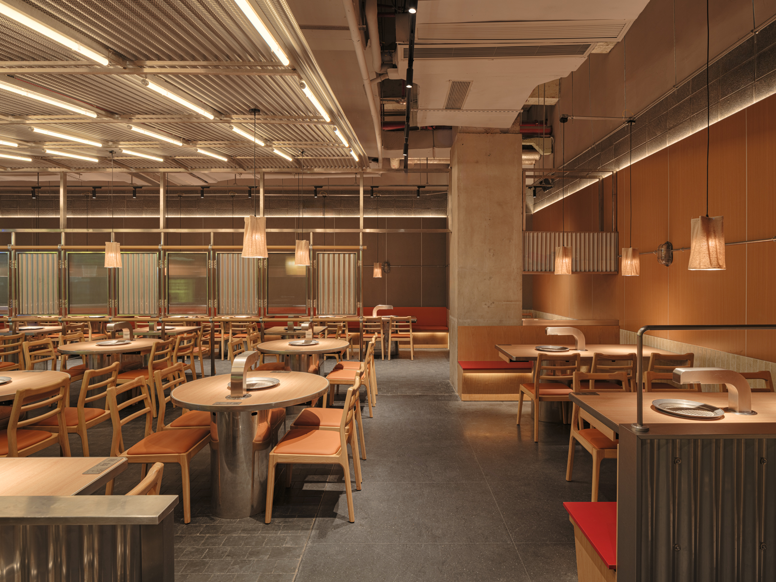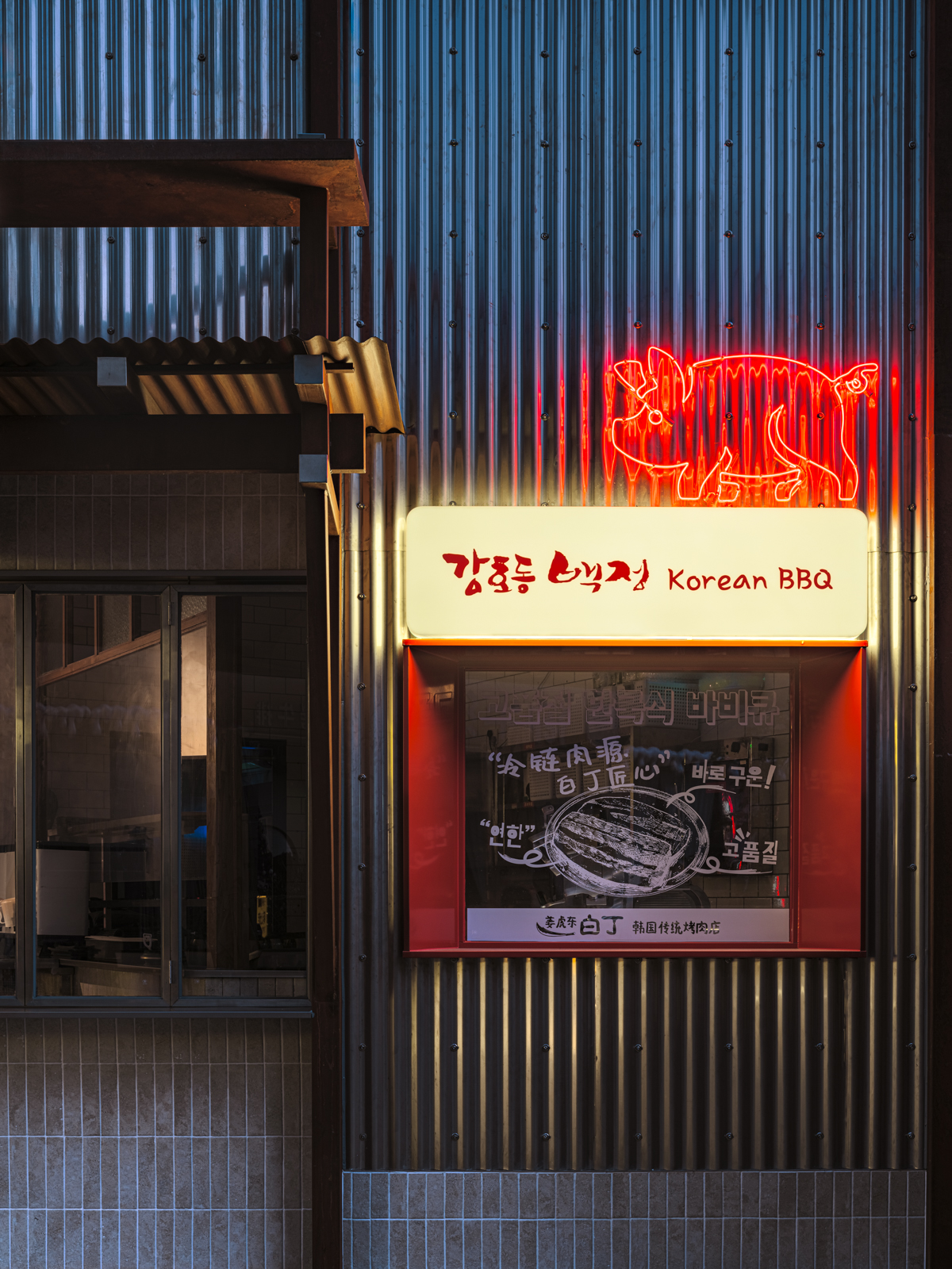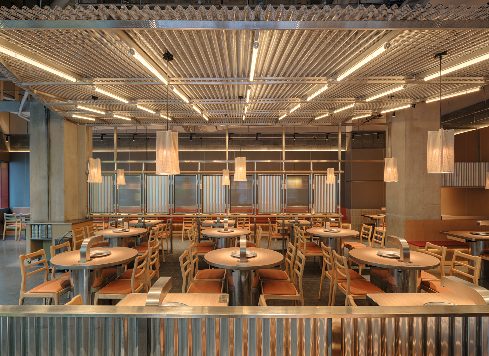 这次姜虎东烤肉的老店改造,并不是要把原来的状态推翻重来,而是顺着它原本的气质,把空间重新整理到一个更舒服的位置。设计从街头出发,借用人们早已习惯的空间逻辑:材料不必精致,结构可以被看见,很多东西就像是自然搭起来的。用餐被放回一种更开放、更接近城市日常的状态,像是在广场、街边,或临时搭起的棚子下面吃饭。