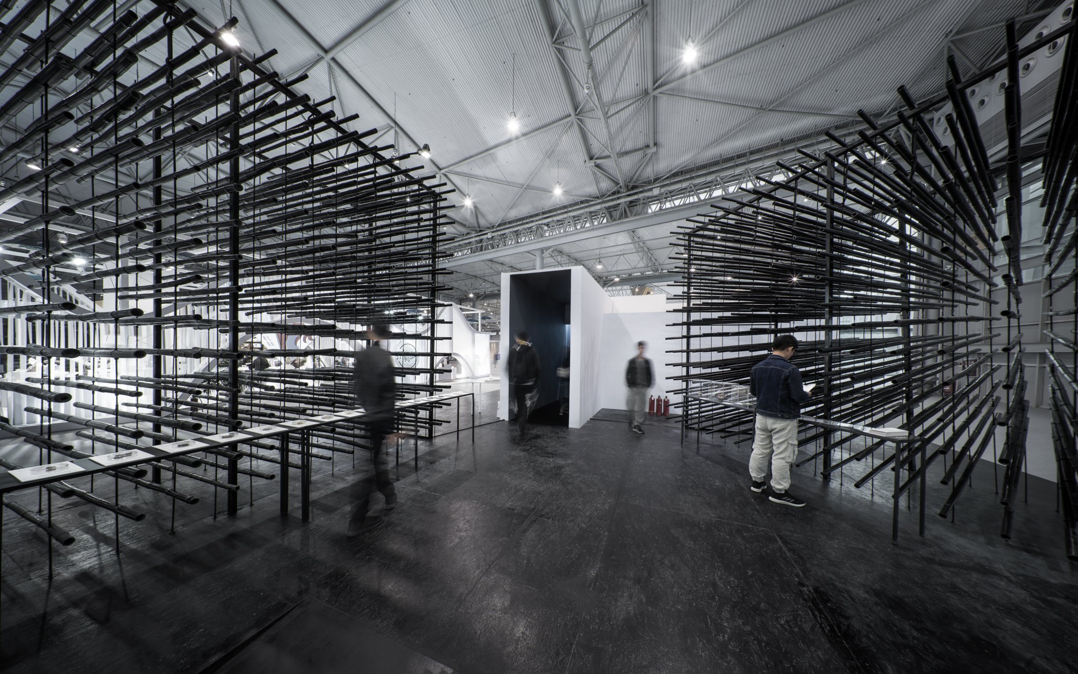 950根喷黑处理后的竹子构架出 两种不同的矩阵: 一侧是横平竖直的有序排列;而另一侧则是蜿蜒曲折的扩散分布。