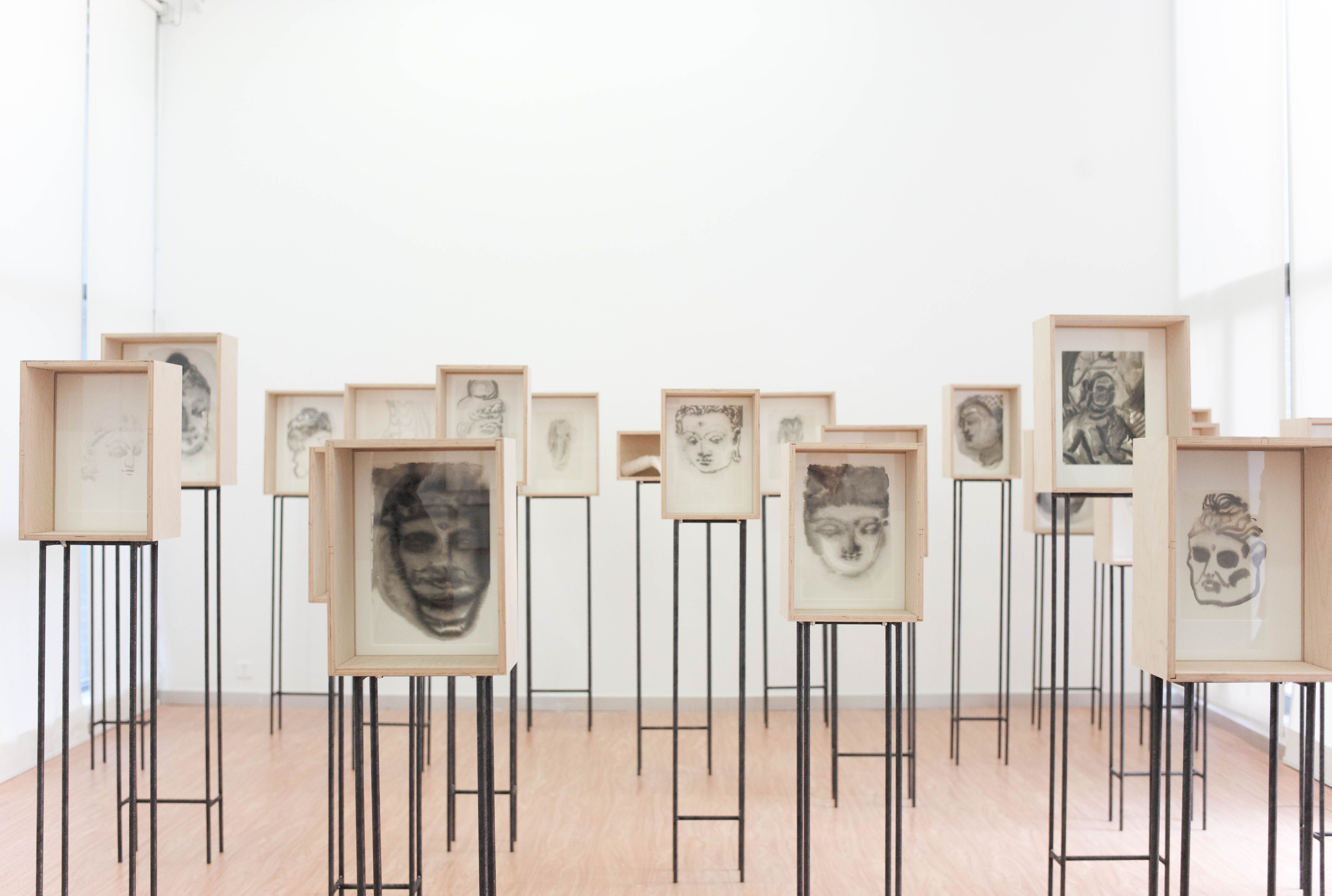 这次画展“玉屑集”,我们受艺术家韩梦云委托,为其佛教题材的墨画,设计并制作出24组木材佛龛及金属展架。