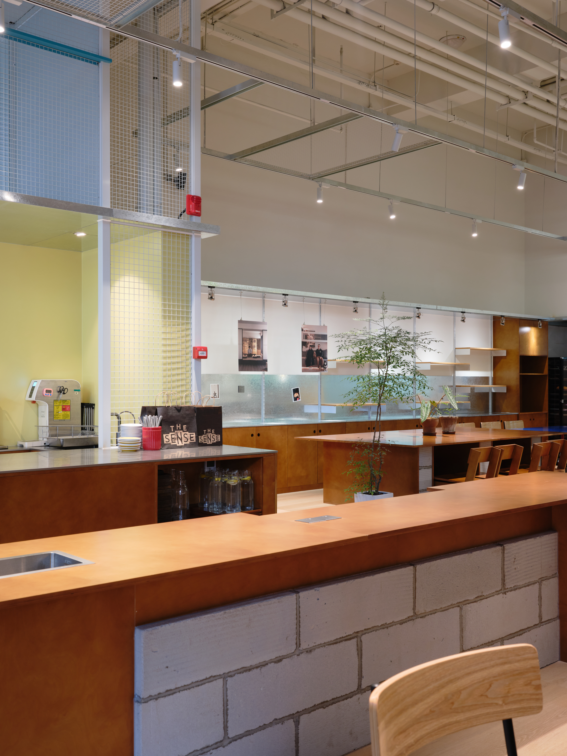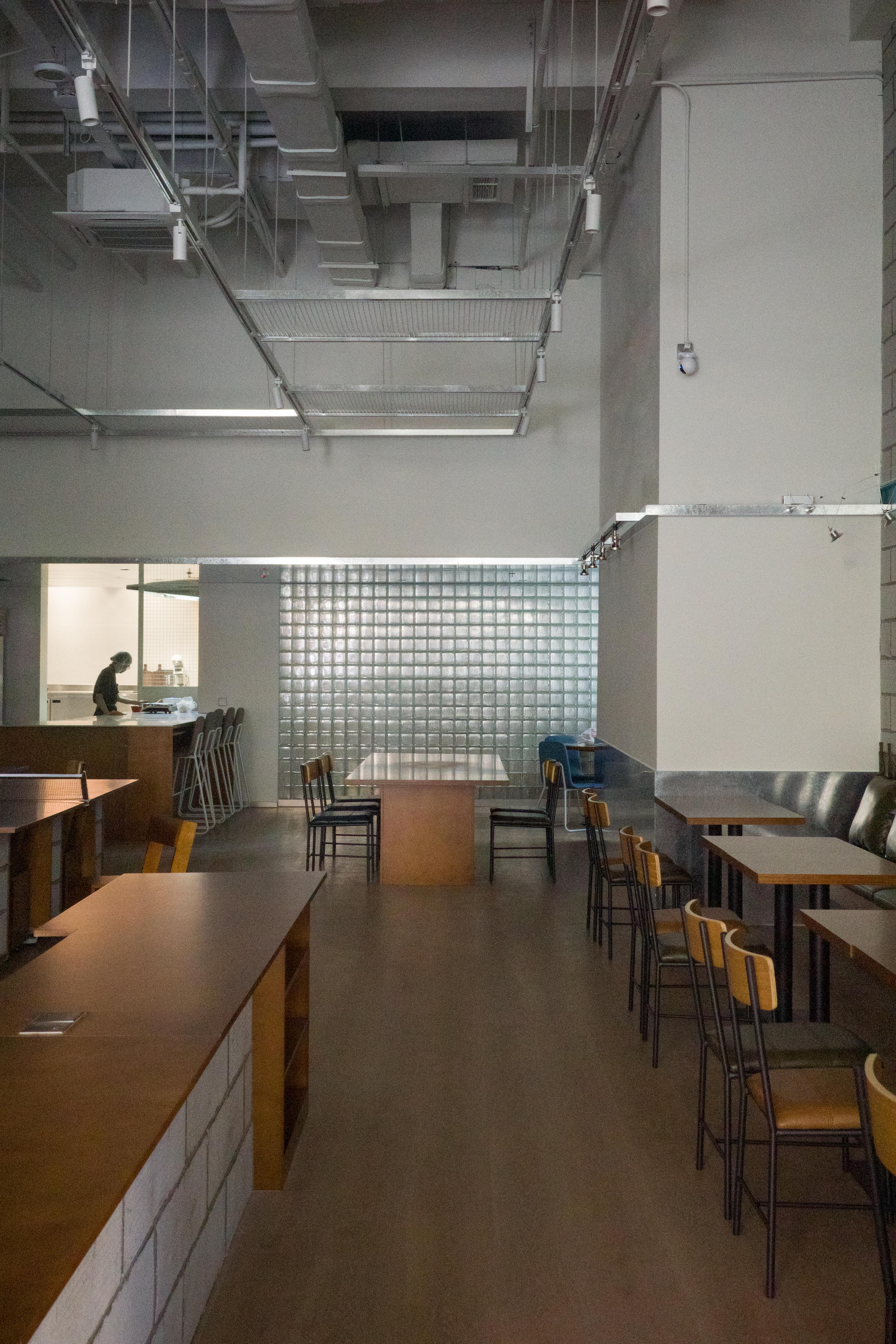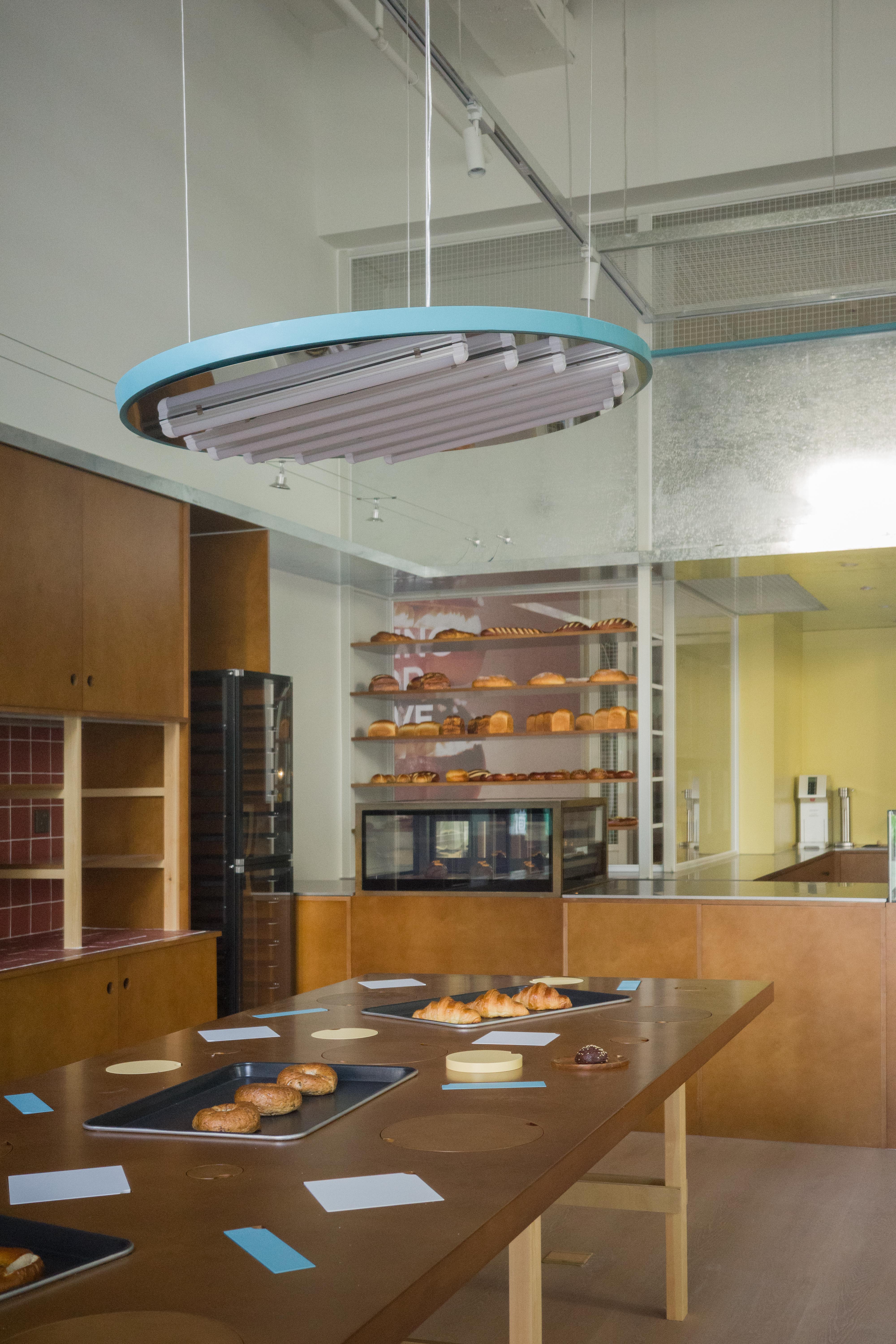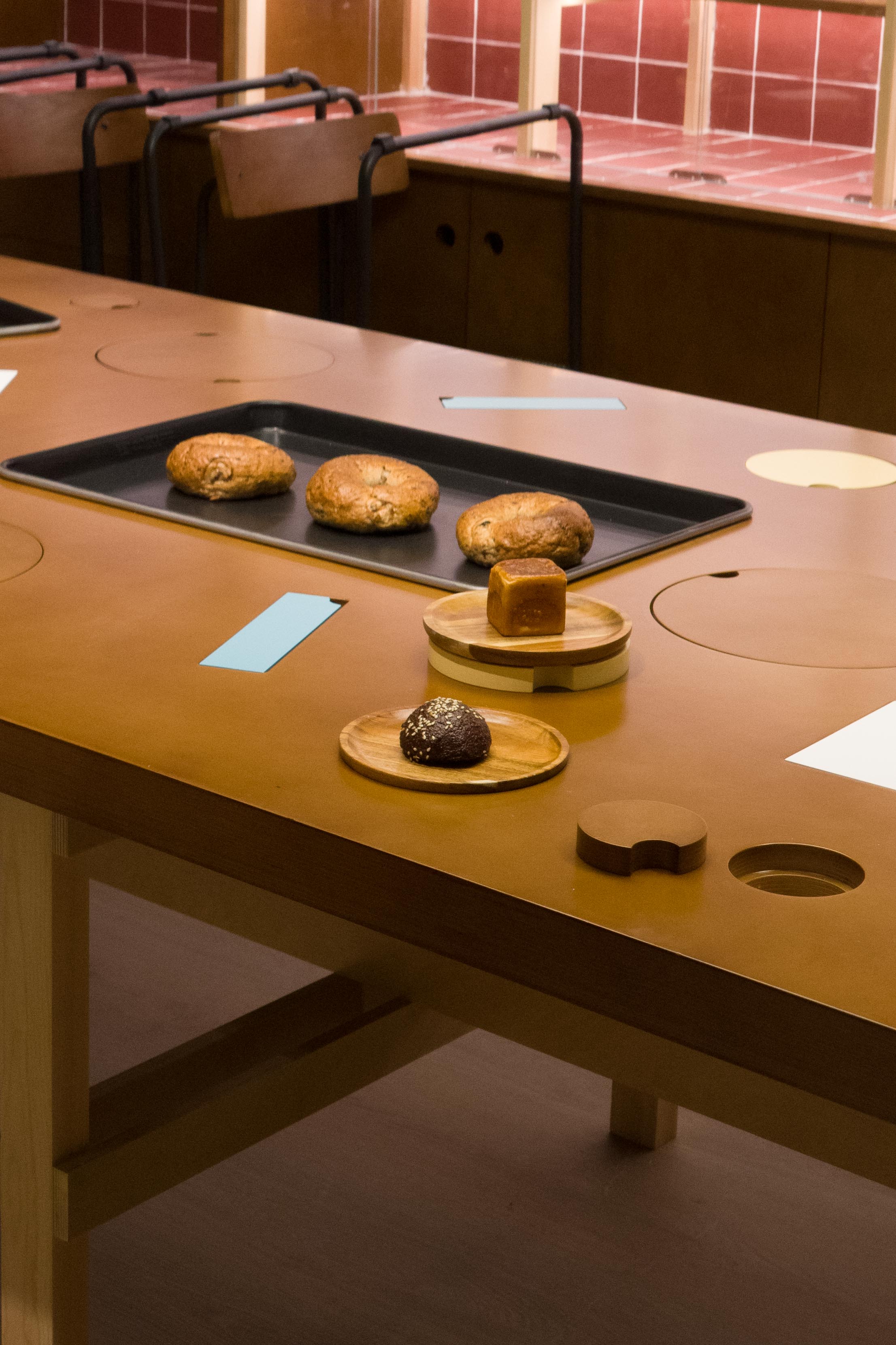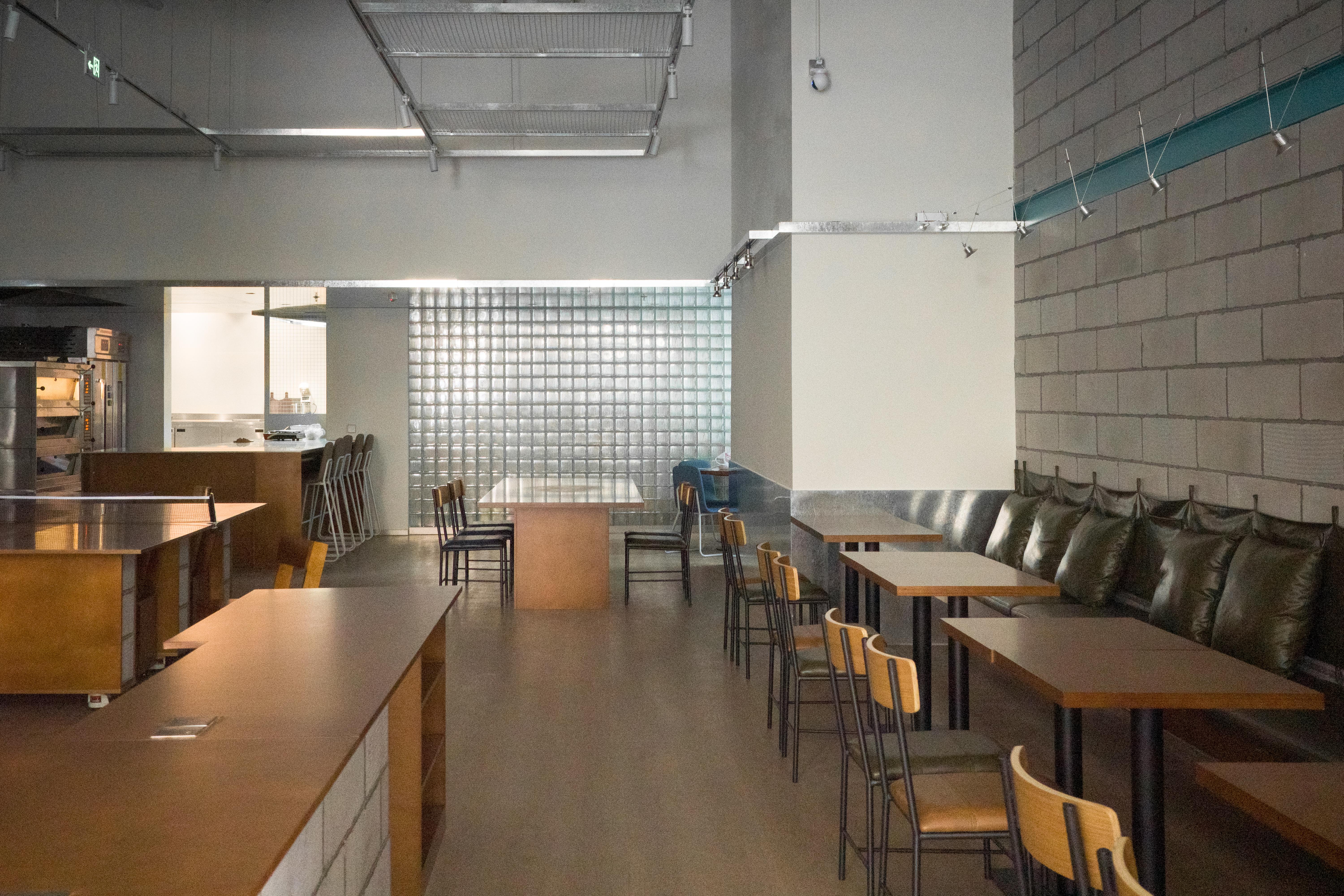 材料的使用延续了一门社一贯的日常取向——砌块砖的堆砌、裸露水泥的原始质感,以及瓷砖细节的朴实表达,都来自我们熟悉的街头语言。空间以五张岛台桌为核心展开:入口处,一张贯穿立面的长桌自然地将室内外连接起来;面包柜前的展示台镶嵌着盘子、杯子与碗的形状,像是生活痕迹的延伸;吧台侧的小岛台提供自助服务;再往里,是一张可用于聚会与办公的大桌子,架上网子便能变成一张乒乓球桌;最里面的开放式操作岛台连接着内部厨房,让面包制作的过程被看见、被分享。空间中点缀的蓝色与黄色,如同烘焙时跳跃的香气,也让这家“醒食”更像一个 studio——一个让生活与面包一同发酵的地方。