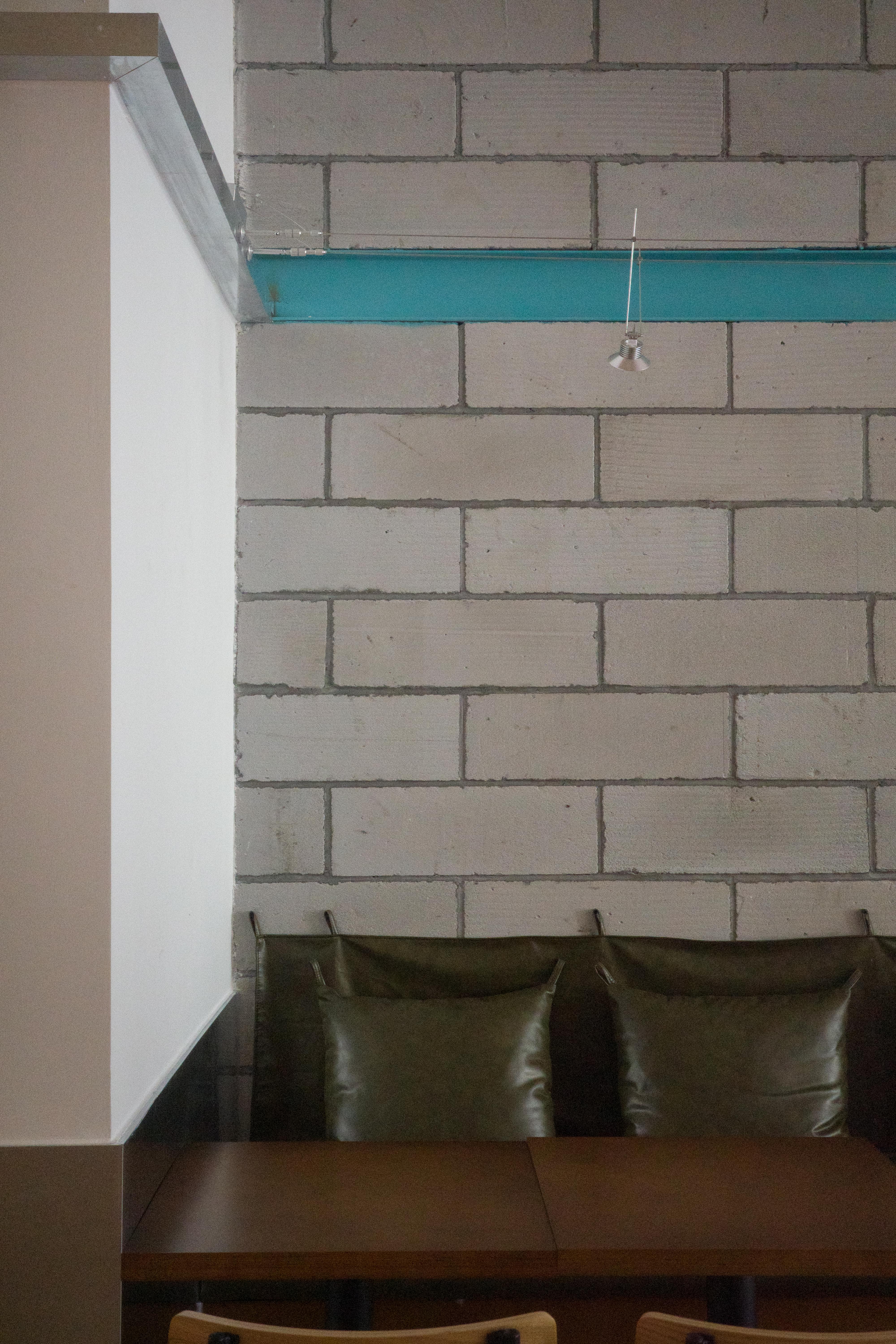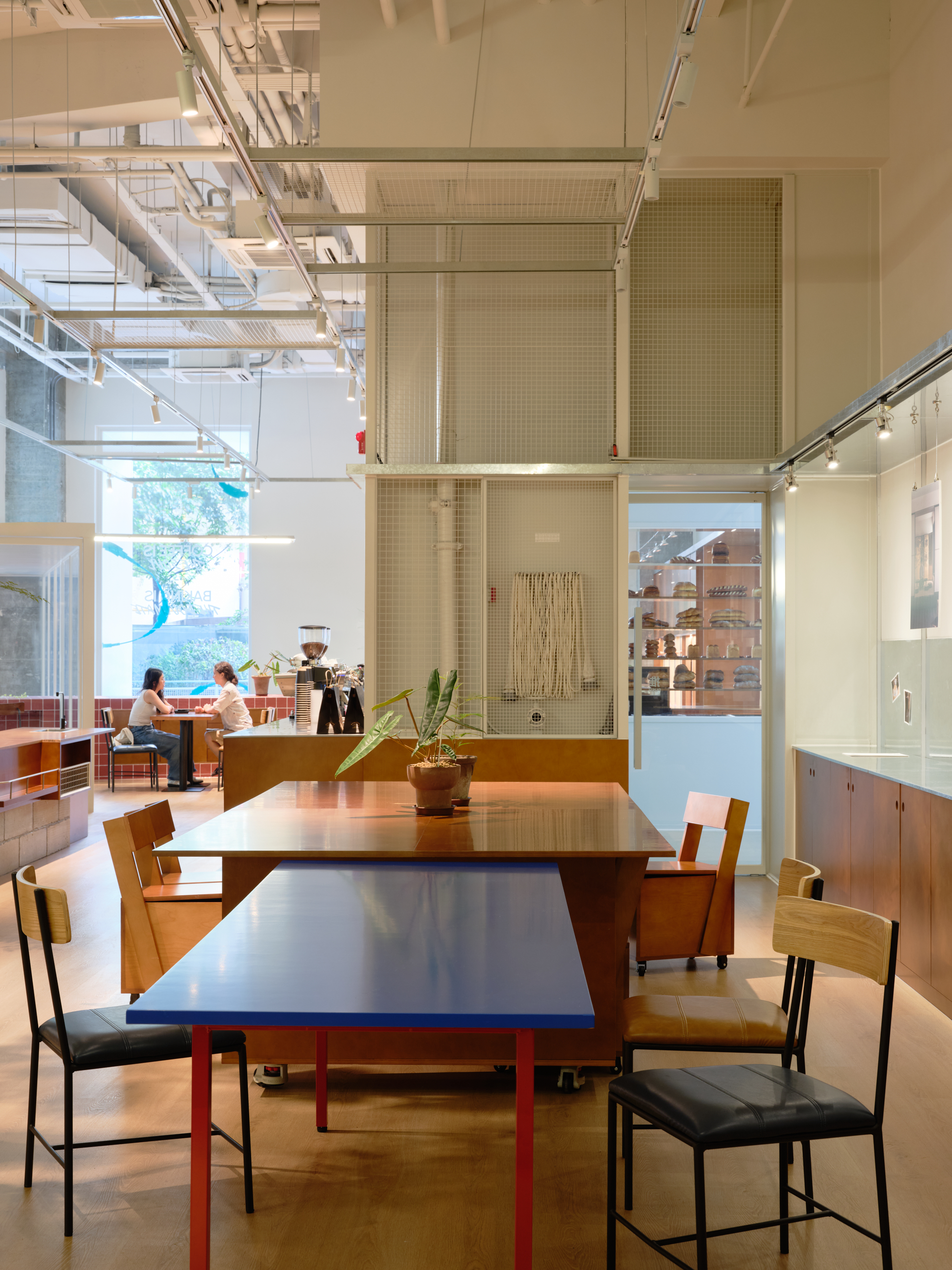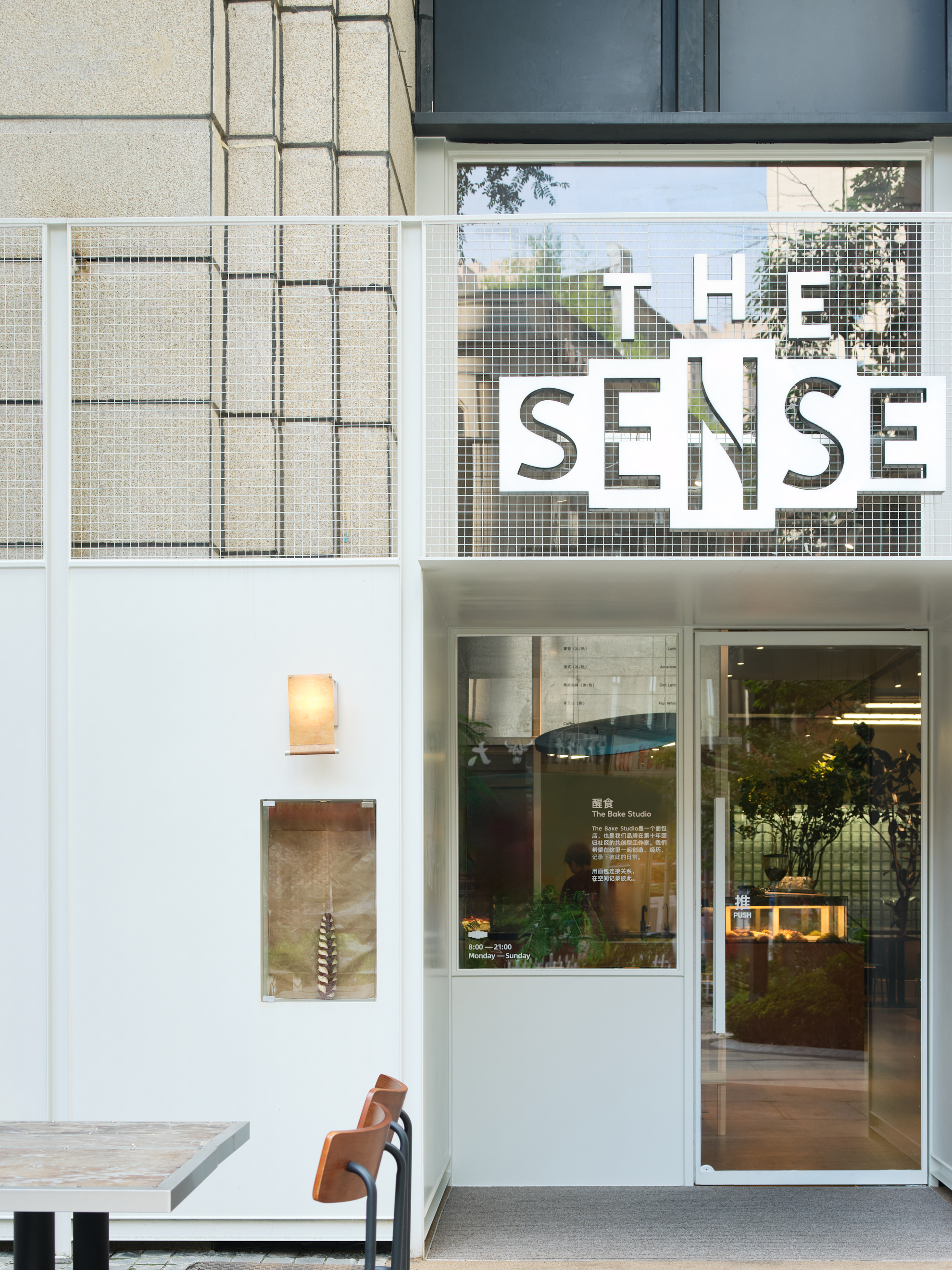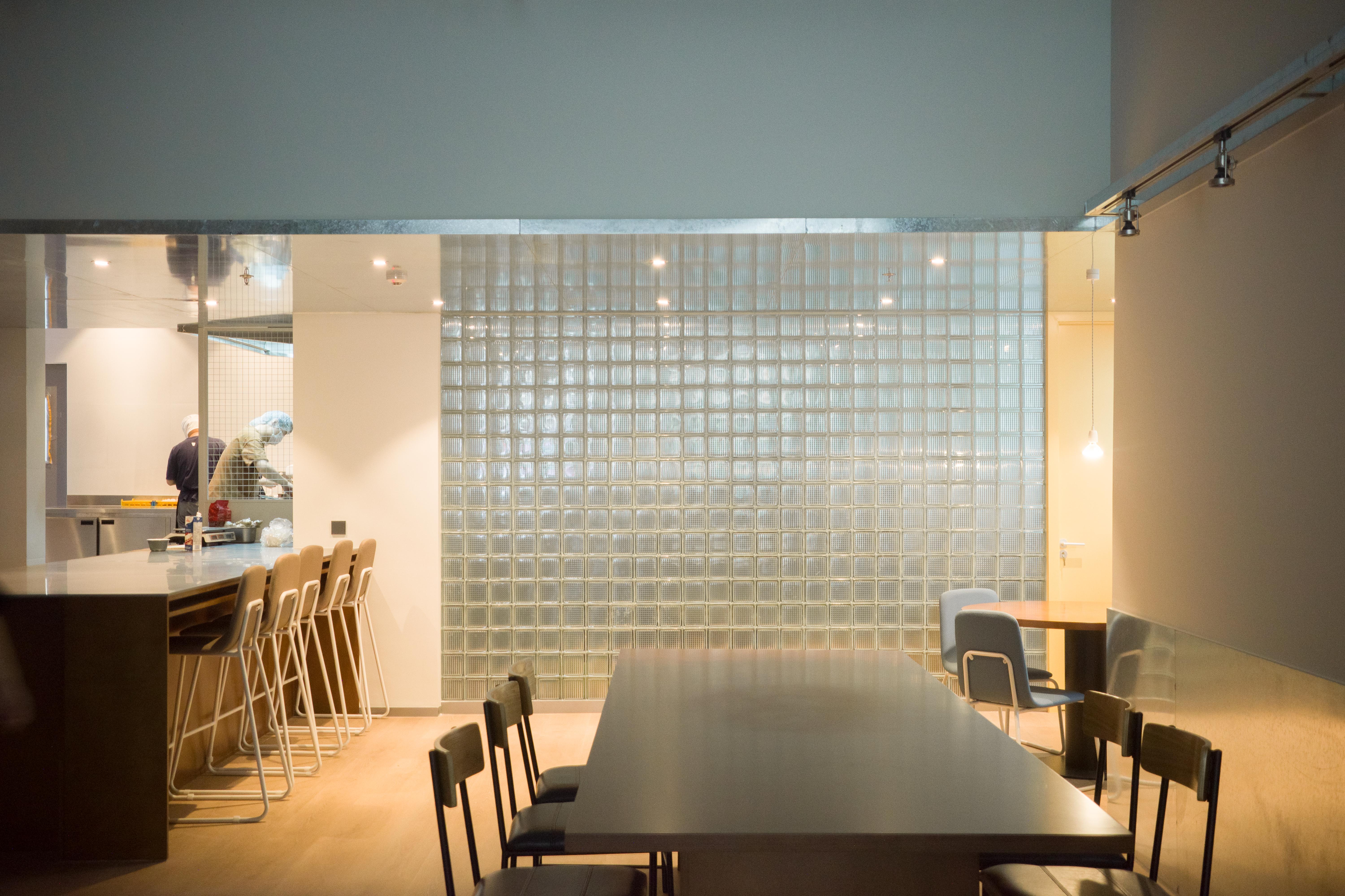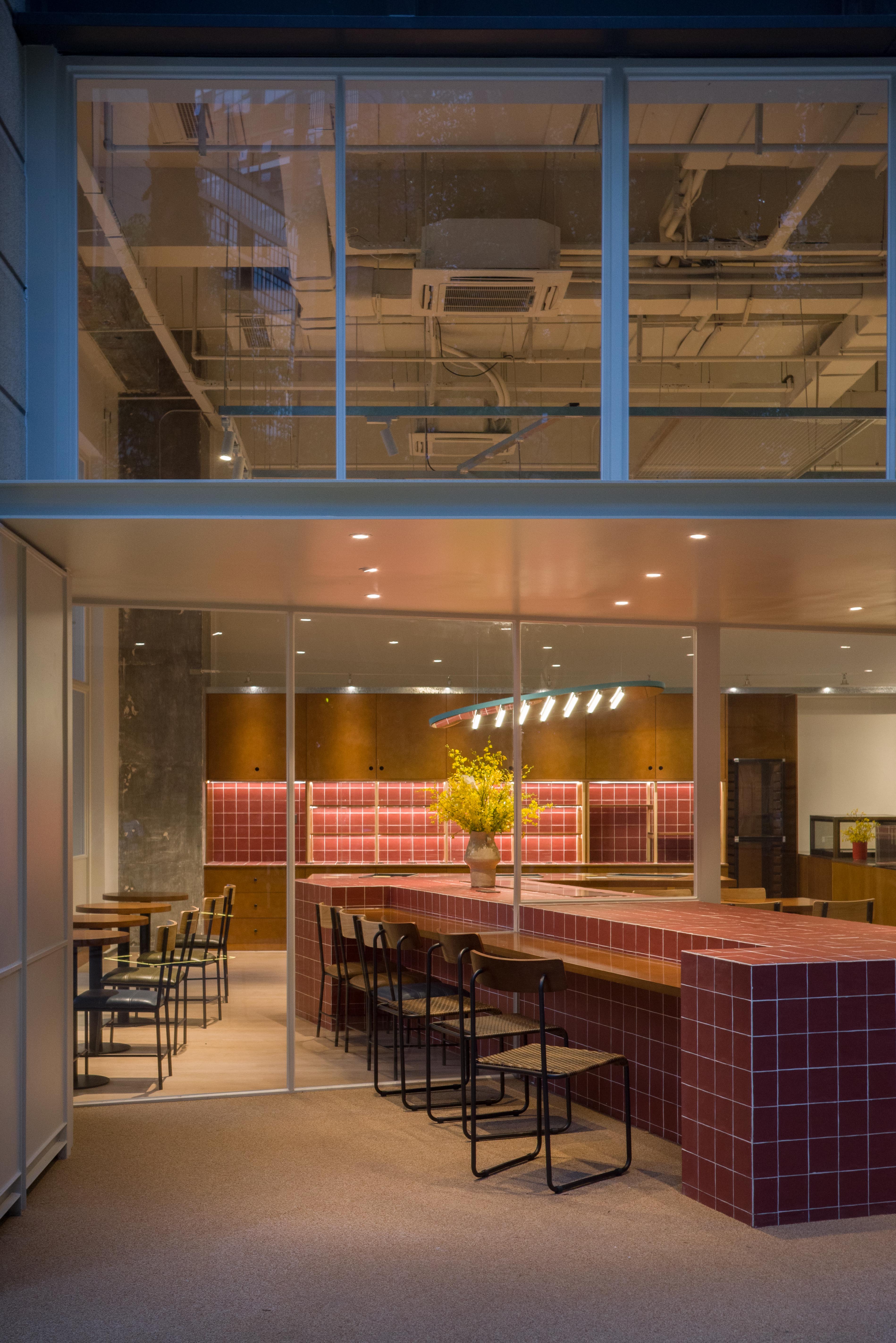 材料的使用延续了一门社一贯的日常取向——砌块砖的堆砌、裸露水泥的原始质感,以及瓷砖细节的朴实表达,都来自我们熟悉的街头语言。空间以五张岛台桌为核心展开:入口处,一张贯穿立面的长桌自然地将室内外连接起来;面包柜前的展示台镶嵌着盘子、杯子与碗的形状,像是生活痕迹的延伸;吧台侧的小岛台提供自助服务;再往里,是一张可用于聚会与办公的大桌子,架上网子便能变成一张乒乓球桌;最里面的开放式操作岛台连接着内部厨房,让面包制作的过程被看见、被分享。空间中点缀的蓝色与黄色,如同烘焙时跳跃的香气,也让这家“醒食”更像一个 studio——一个让生活与面包一同发酵的地方。