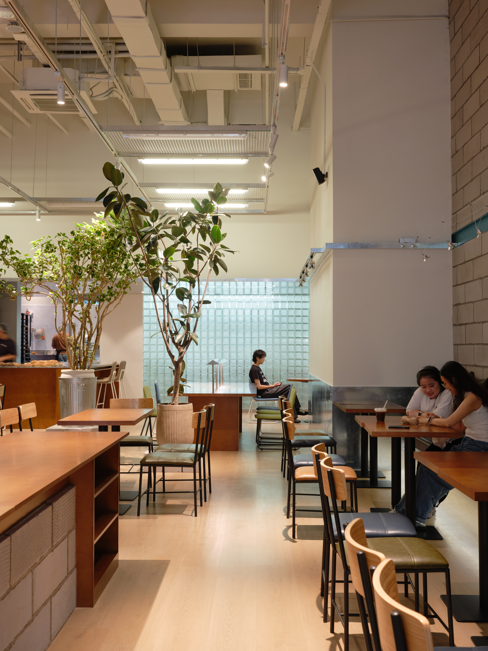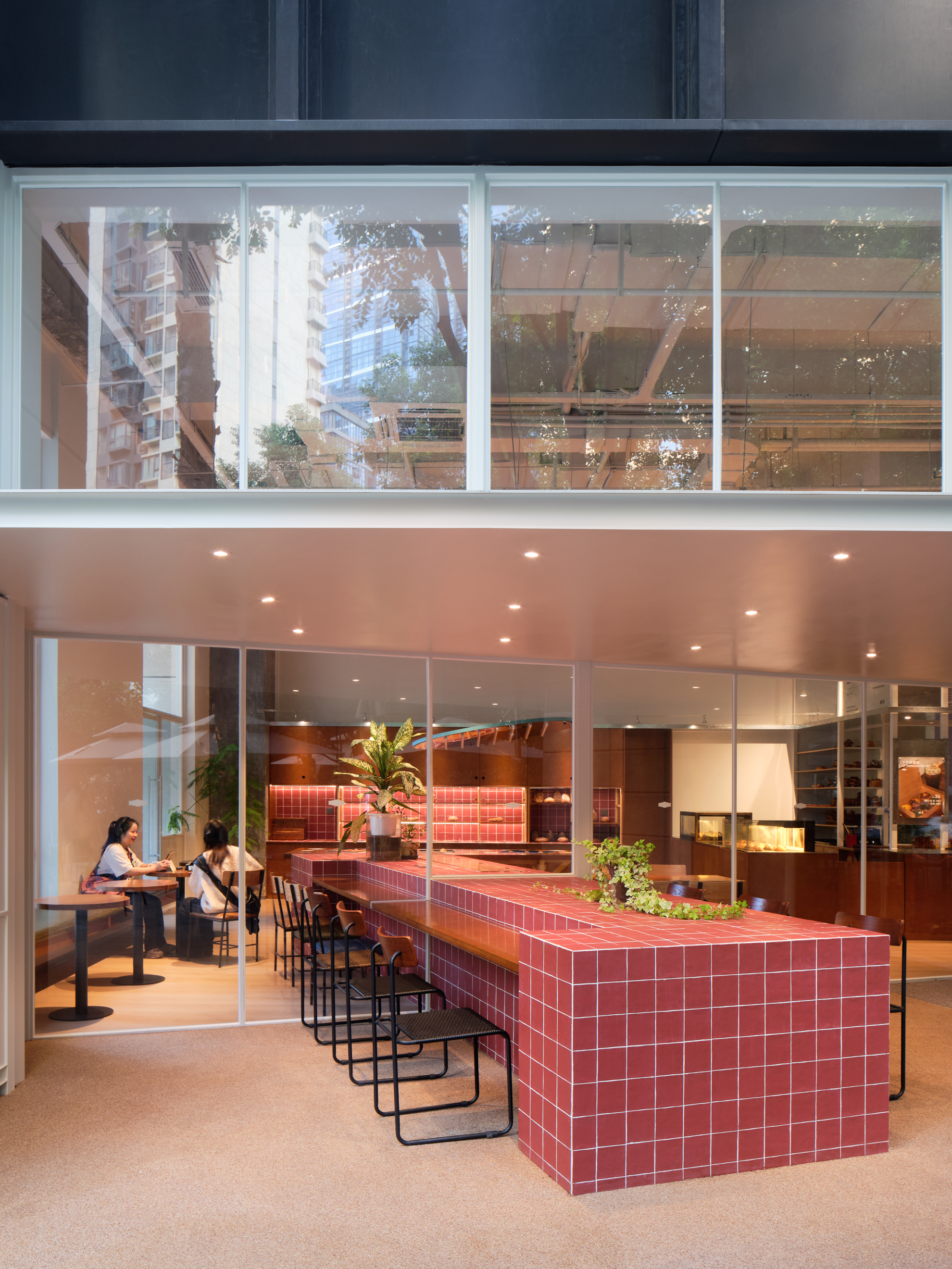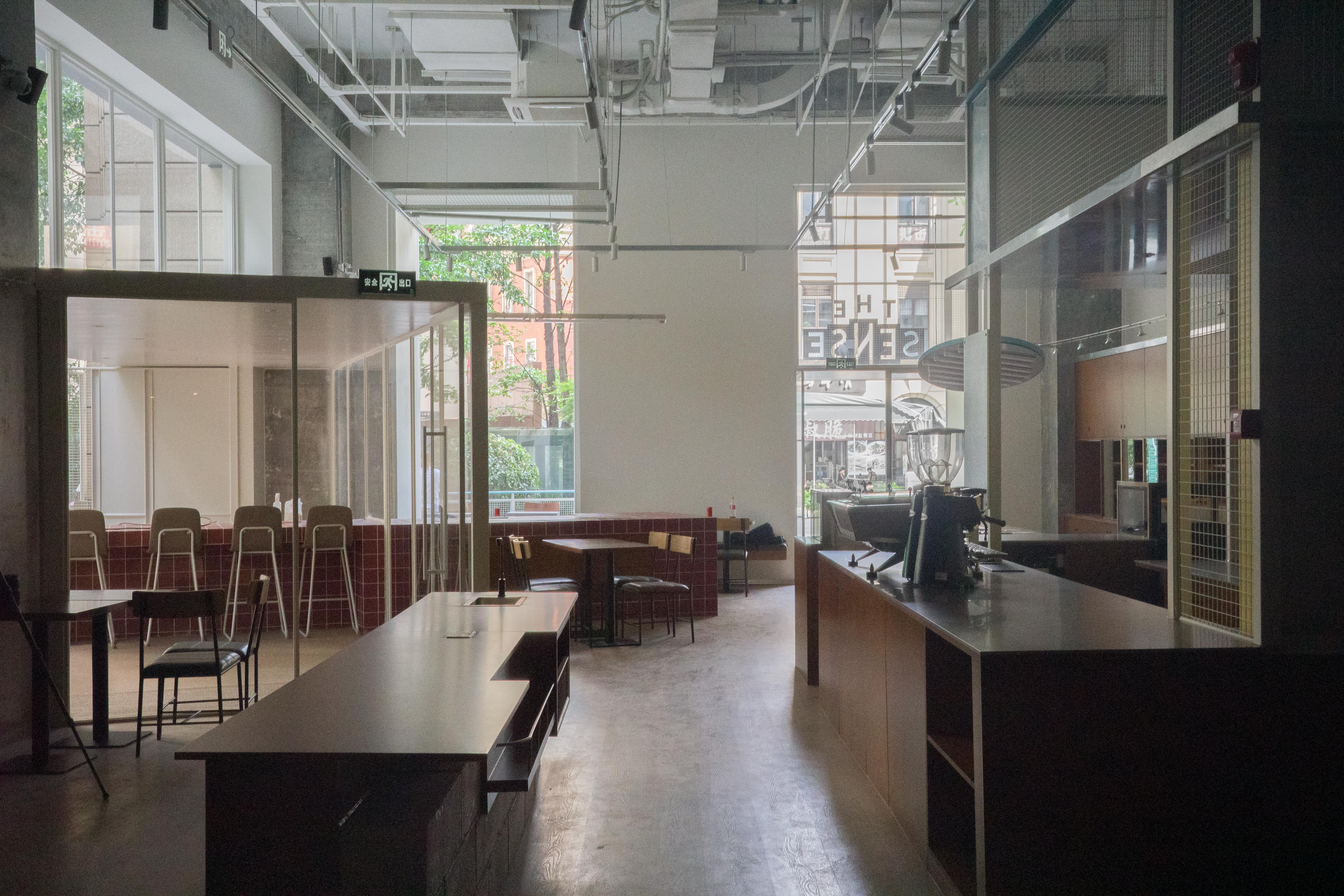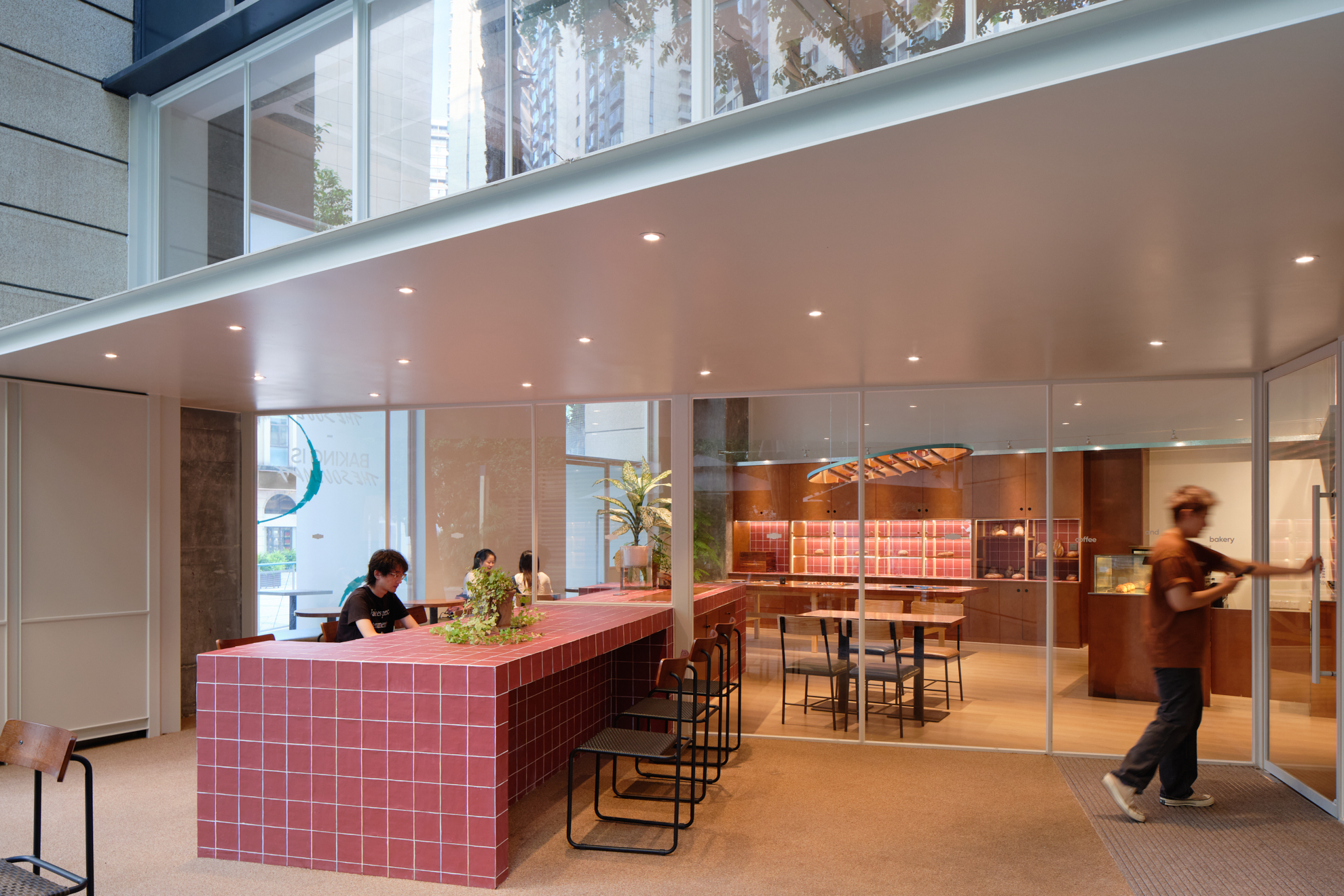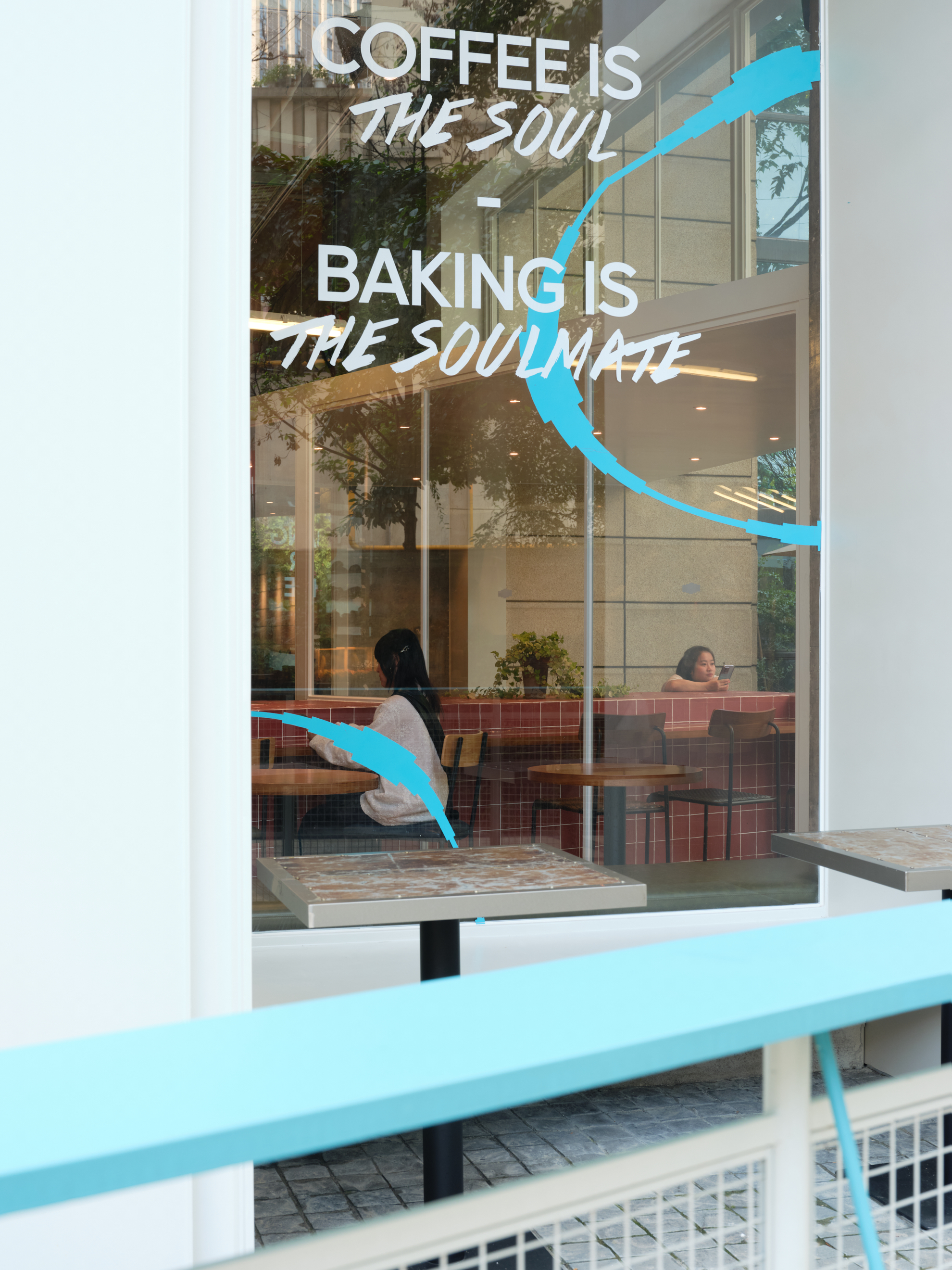 材料的使用延续了一门社一贯的日常取向——砌块砖的堆砌、裸露水泥的原始质感,以及瓷砖细节的朴实表达,都来自我们熟悉的街头语言。空间以五张岛台桌为核心展开:入口处,一张贯穿立面的长桌自然地将室内外连接起来;面包柜前的展示台镶嵌着盘子、杯子与碗的形状,像是生活痕迹的延伸;吧台侧的小岛台提供自助服务;再往里,是一张可用于聚会与办公的大桌子,架上网子便能变成一张乒乓球桌;最里面的开放式操作岛台连接着内部厨房,让面包制作的过程被看见、被分享。空间中点缀的蓝色与黄色,如同烘焙时跳跃的香气,也让这家“醒食”更像一个 studio——一个让生活与面包一同发酵的地方。