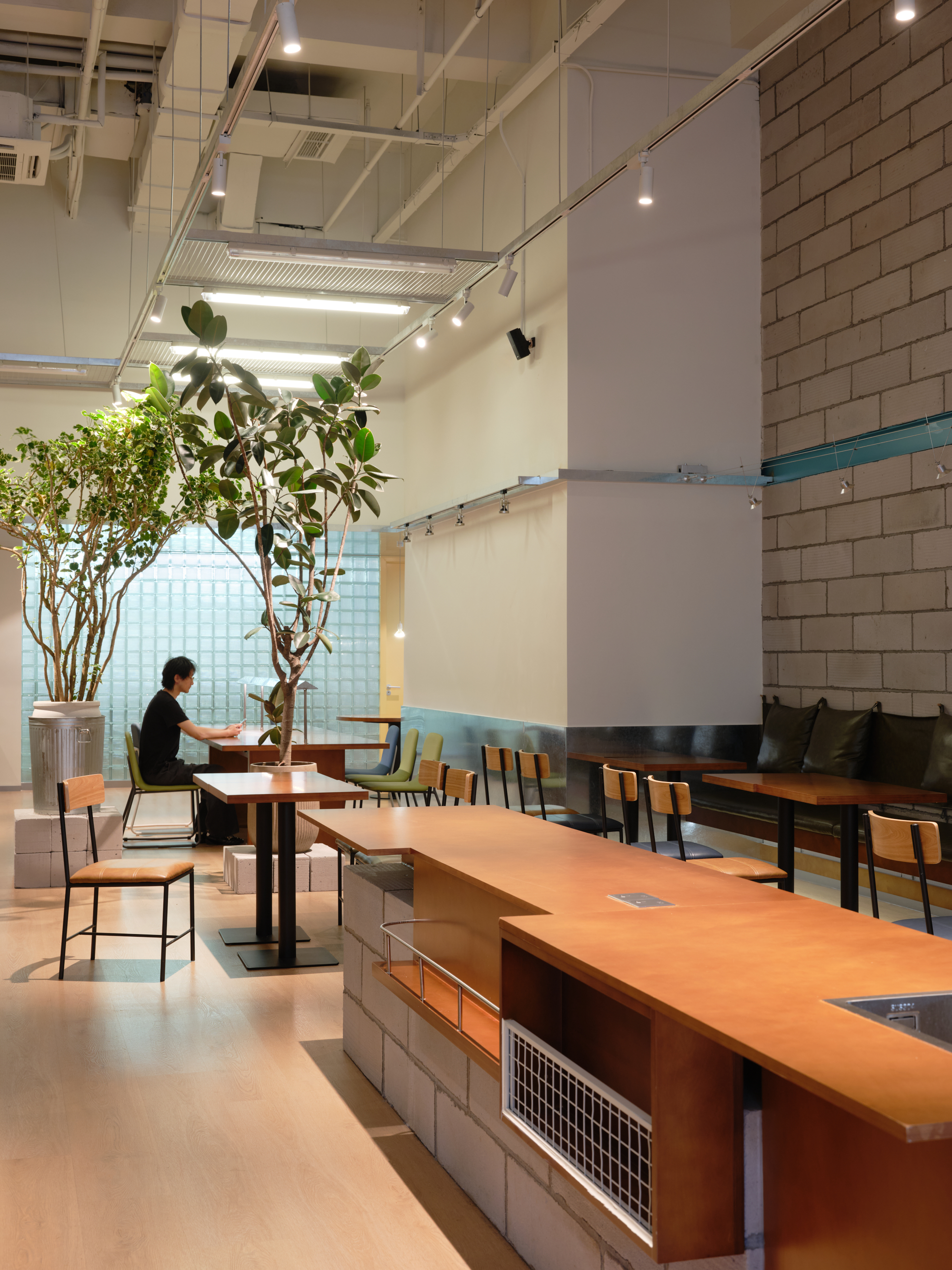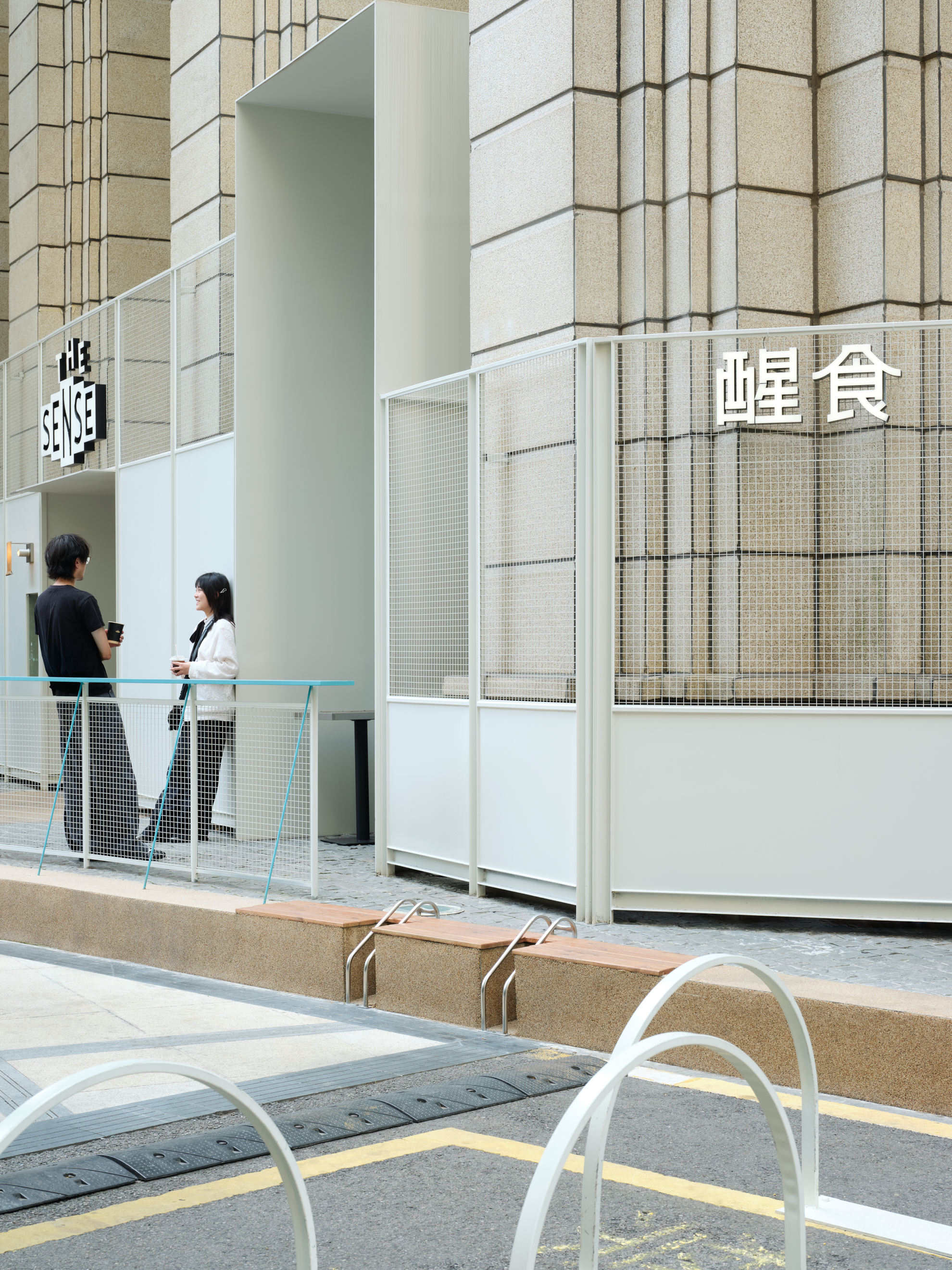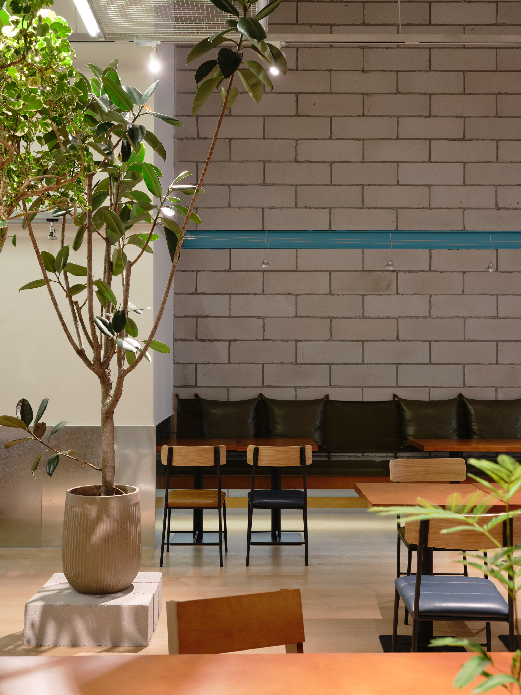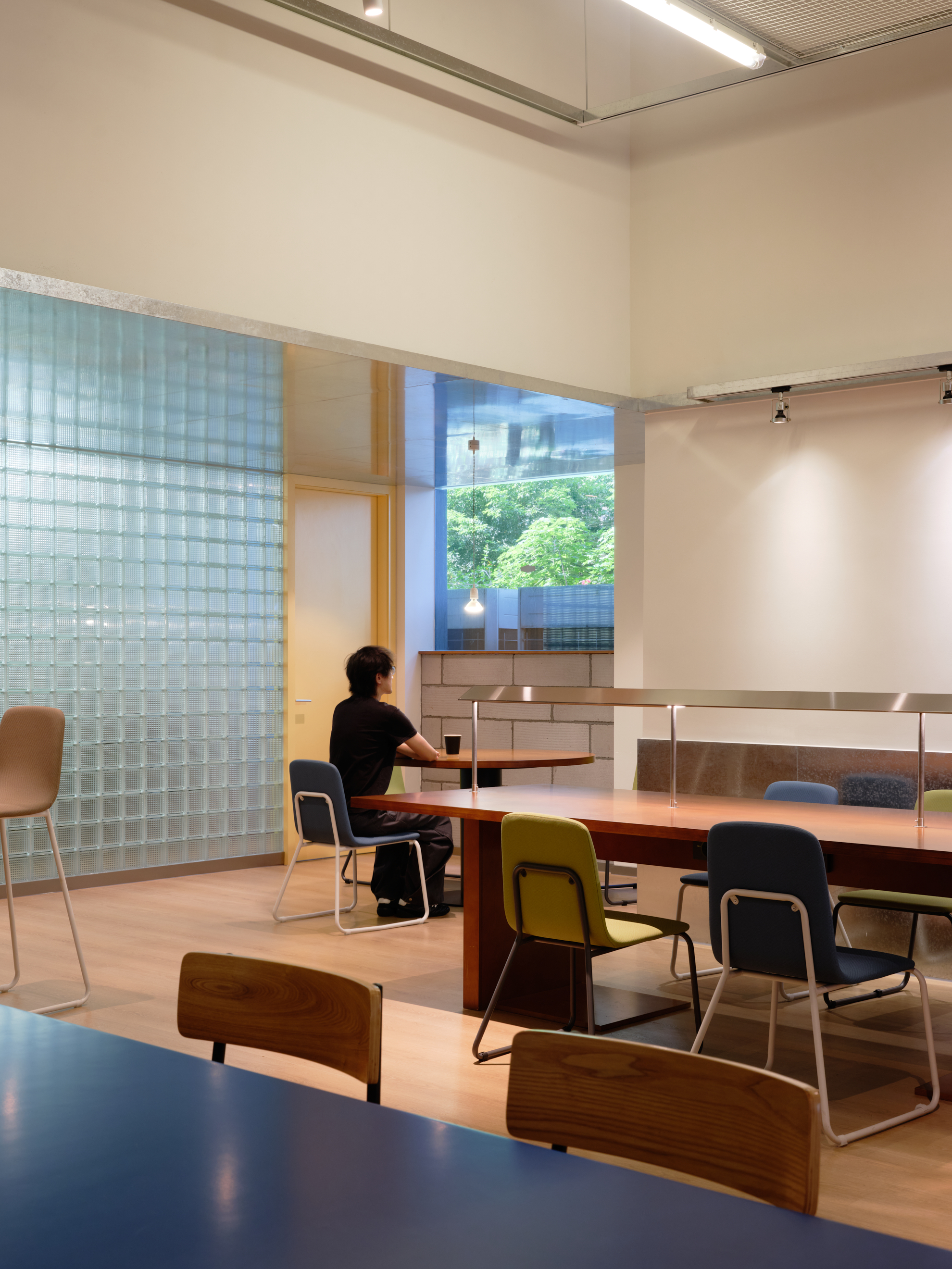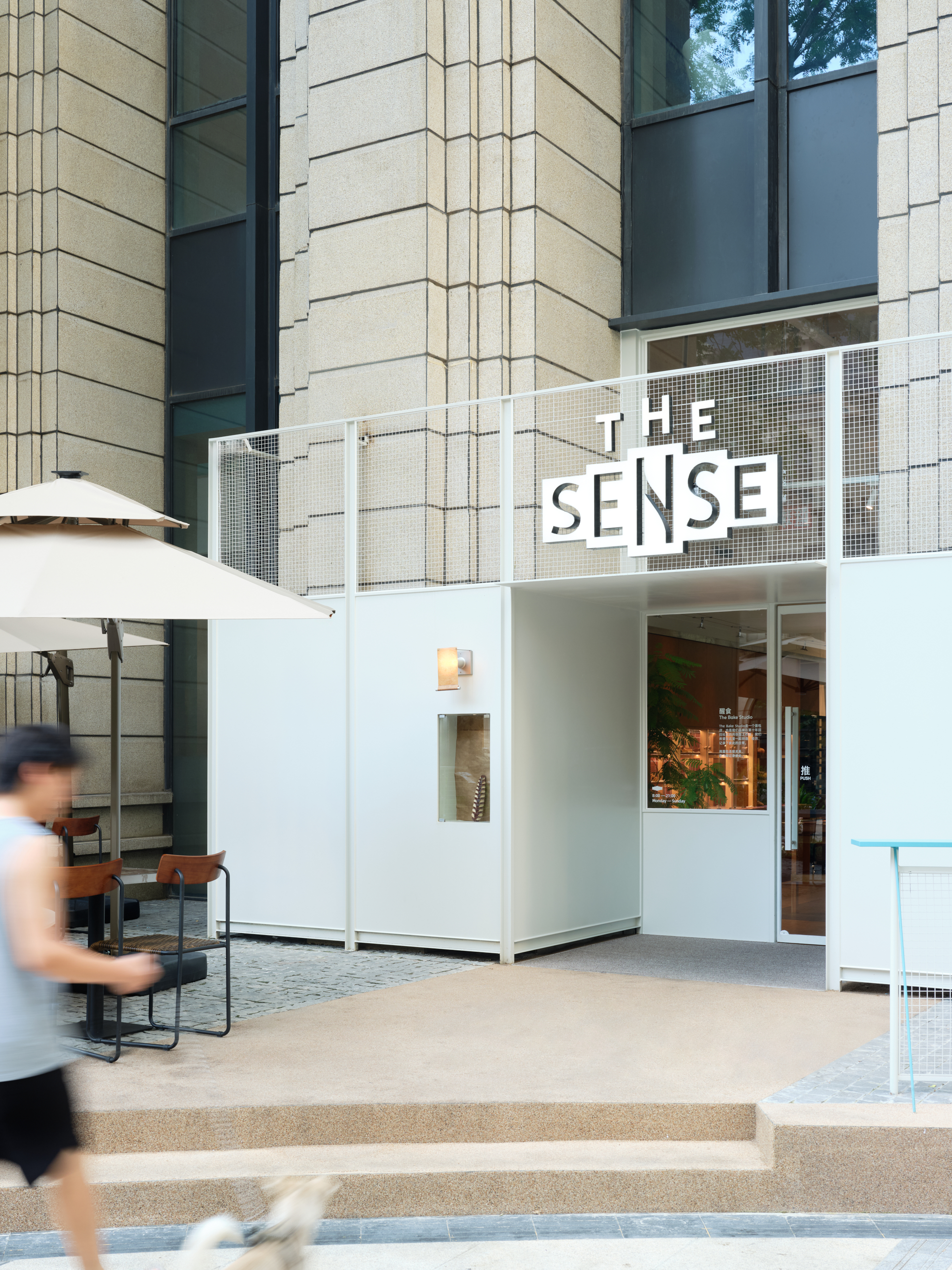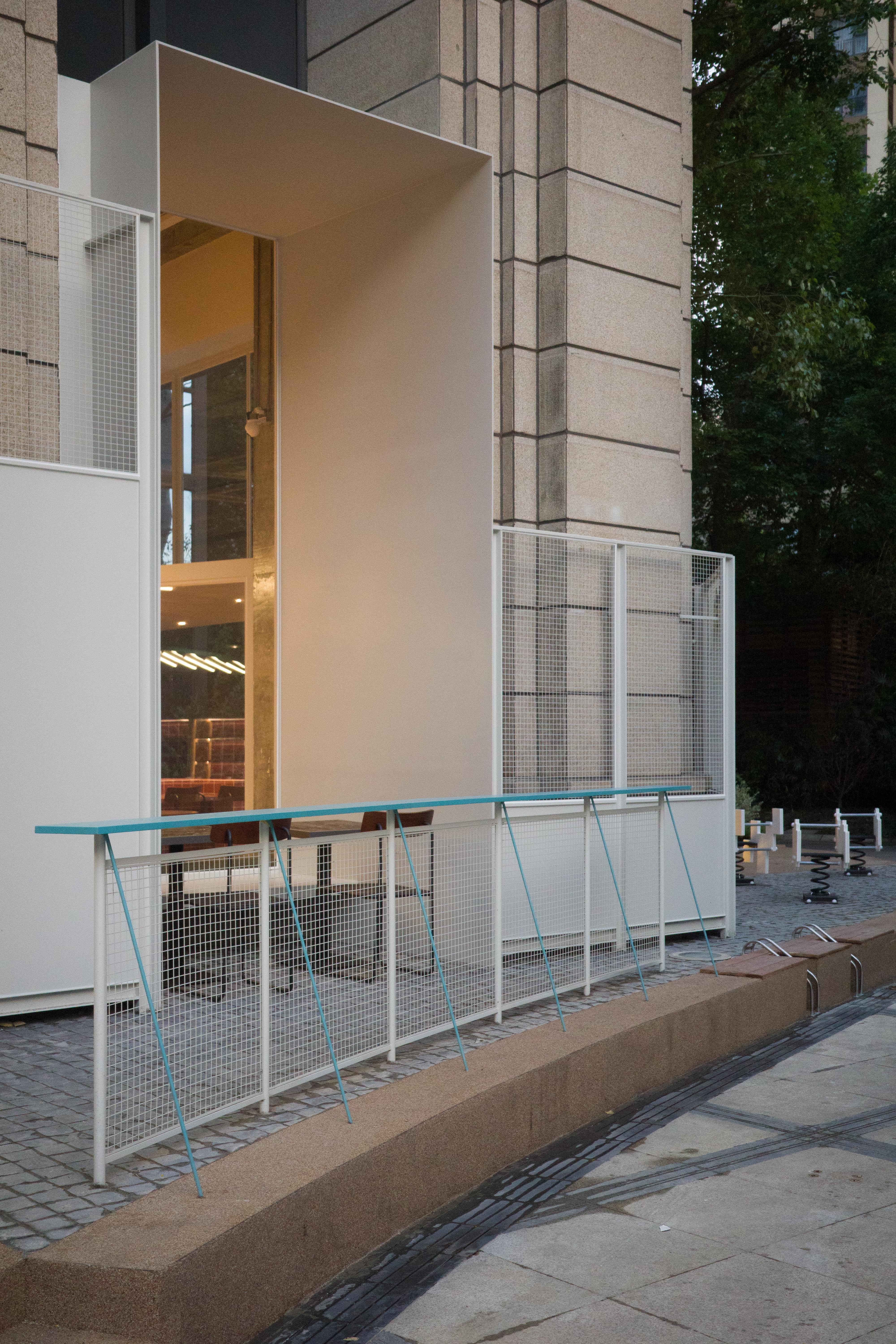 材料的使用延续了一门社一贯的日常取向——砌块砖的堆砌、裸露水泥的原始质感,以及瓷砖细节的朴实表达,都来自我们熟悉的街头语言。空间以五张岛台桌为核心展开:入口处,一张贯穿立面的长桌自然地将室内外连接起来;面包柜前的展示台镶嵌着盘子、杯子与碗的形状,像是生活痕迹的延伸;吧台侧的小岛台提供自助服务;再往里,是一张可用于聚会与办公的大桌子,架上网子便能变成一张乒乓球桌;最里面的开放式操作岛台连接着内部厨房,让面包制作的过程被看见、被分享。空间中点缀的蓝色与黄色,如同烘焙时跳跃的香气,也让这家“醒食”更像一个 studio——一个让生活与面包一同发酵的地方。