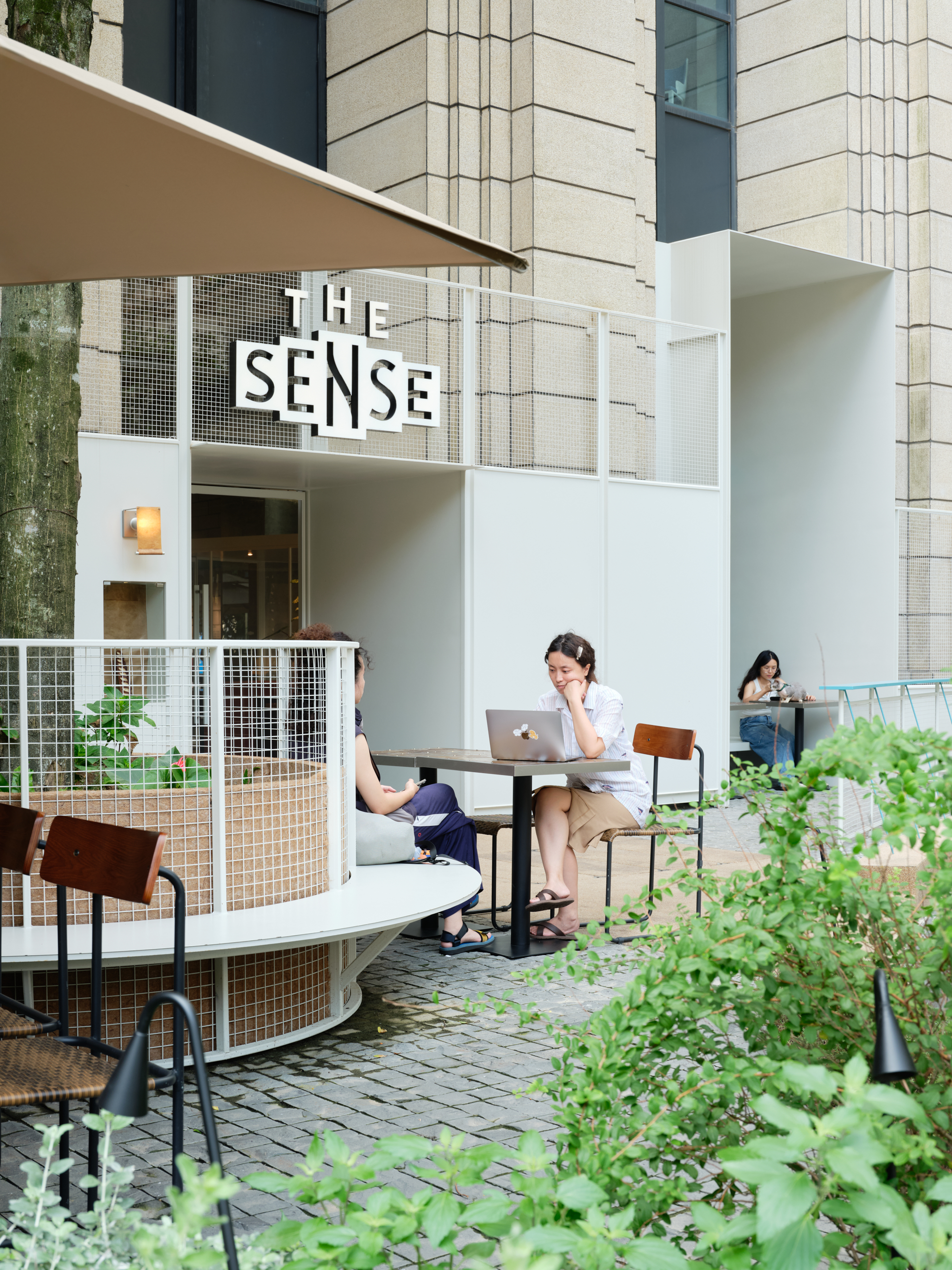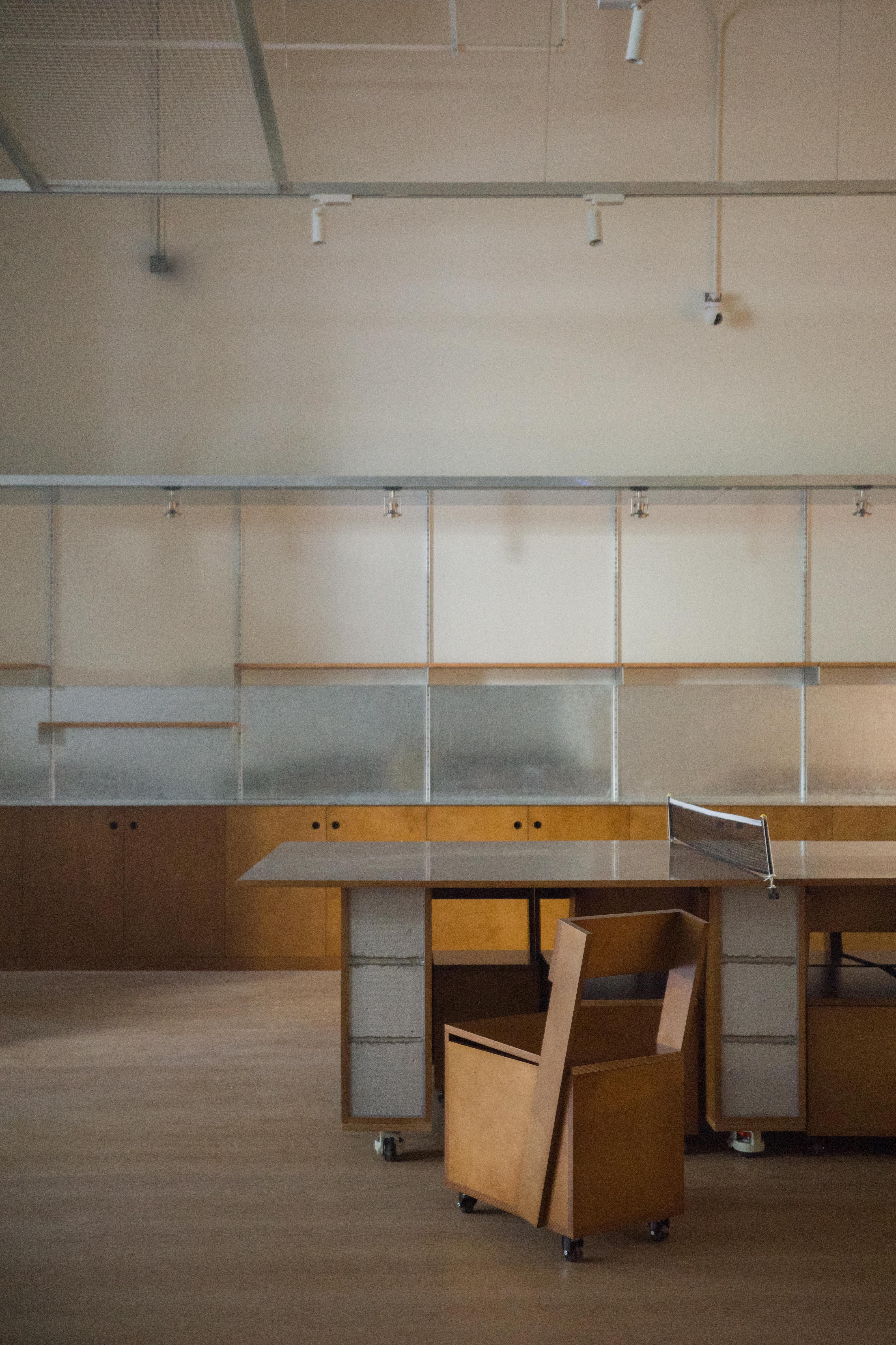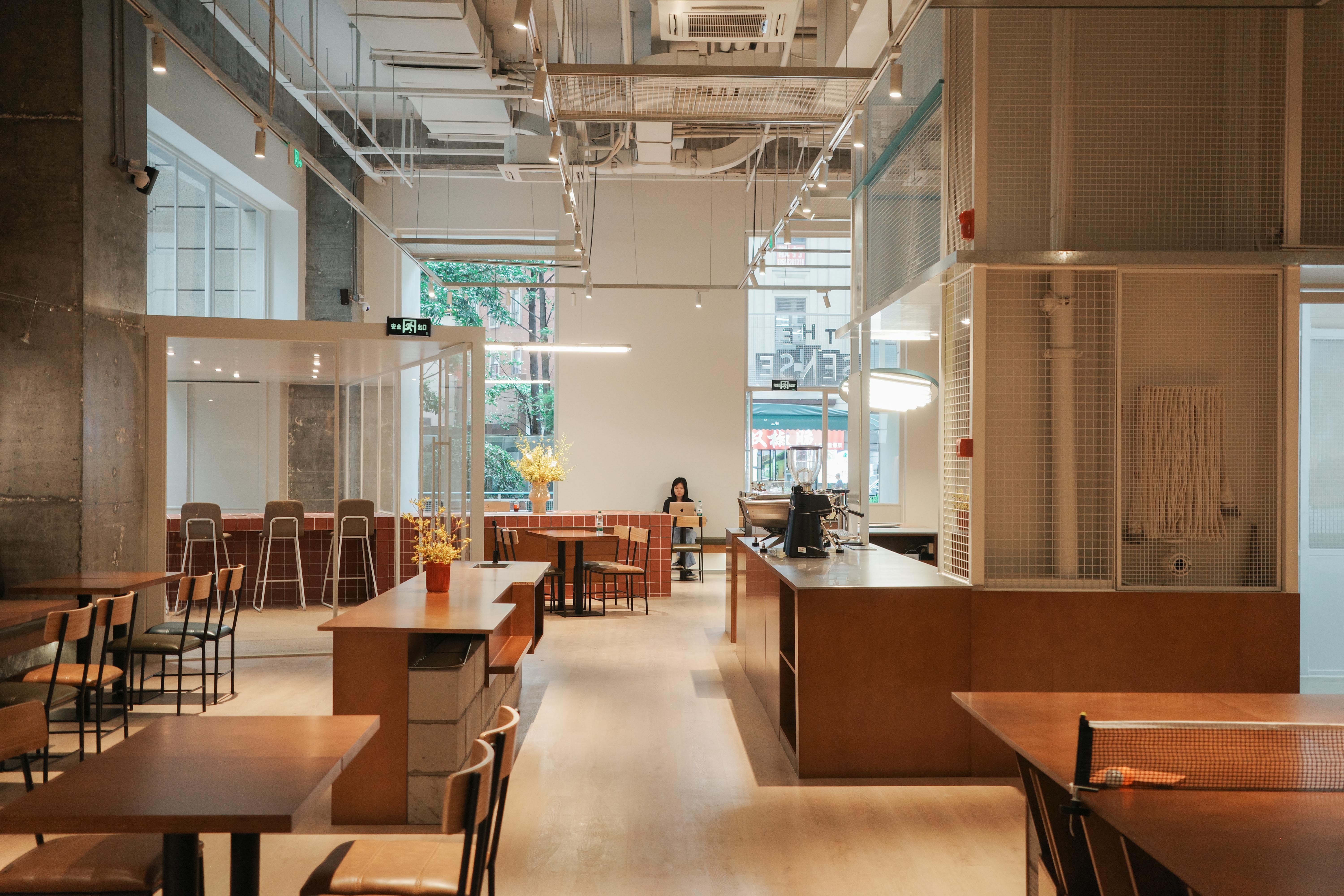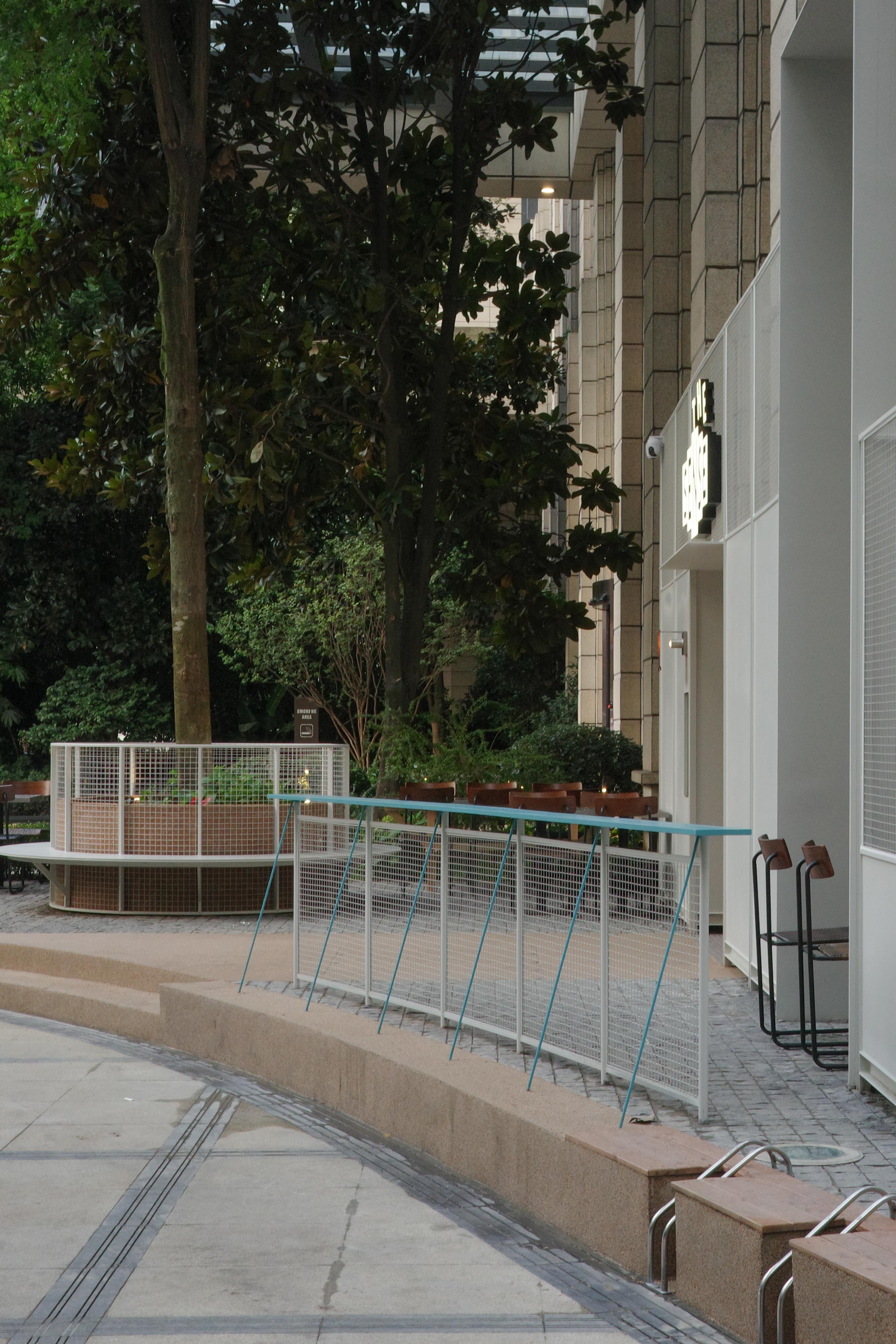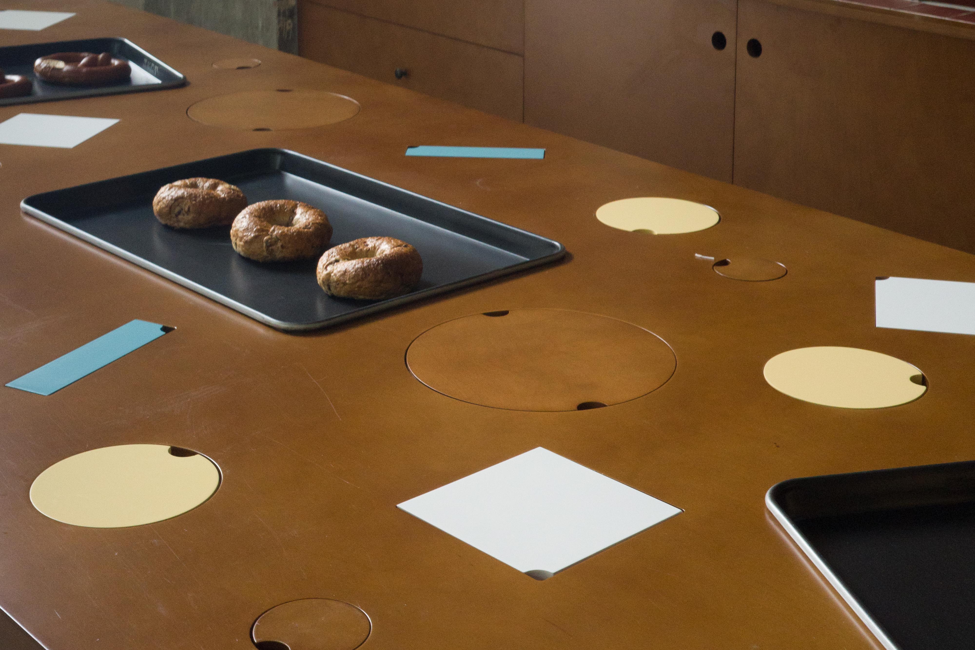 材料的使用延续了一门社一贯的日常取向——砌块砖的堆砌、裸露水泥的原始质感,以及瓷砖细节的朴实表达,都来自我们熟悉的街头语言。空间以五张岛台桌为核心展开:入口处,一张贯穿立面的长桌自然地将室内外连接起来;面包柜前的展示台镶嵌着盘子、杯子与碗的形状,像是生活痕迹的延伸;吧台侧的小岛台提供自助服务;再往里,是一张可用于聚会与办公的大桌子,架上网子便能变成一张乒乓球桌;最里面的开放式操作岛台连接着内部厨房,让面包制作的过程被看见、被分享。空间中点缀的蓝色与黄色,如同烘焙时跳跃的香气,也让这家“醒食”更像一个 studio——一个让生活与面包一同发酵的地方。