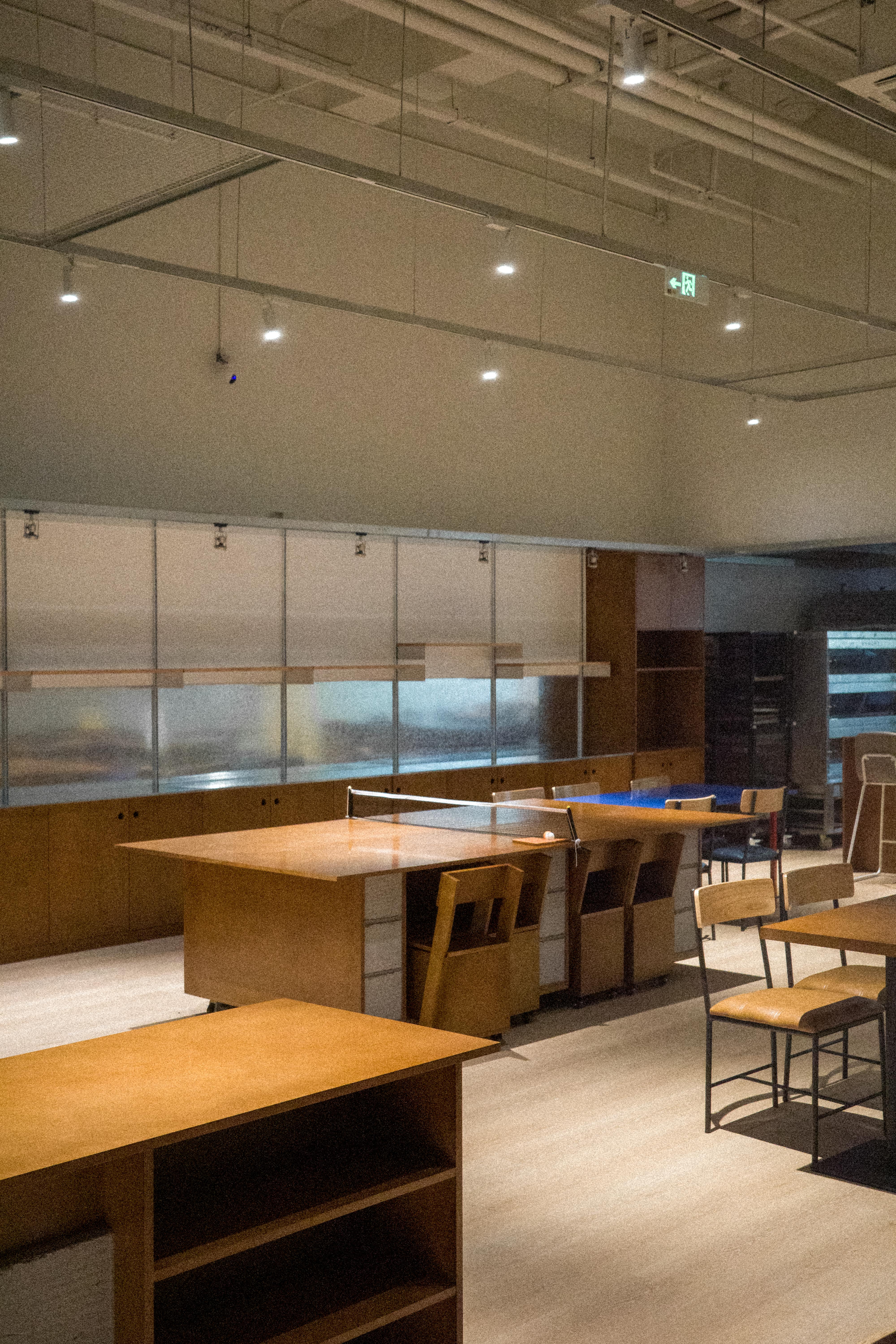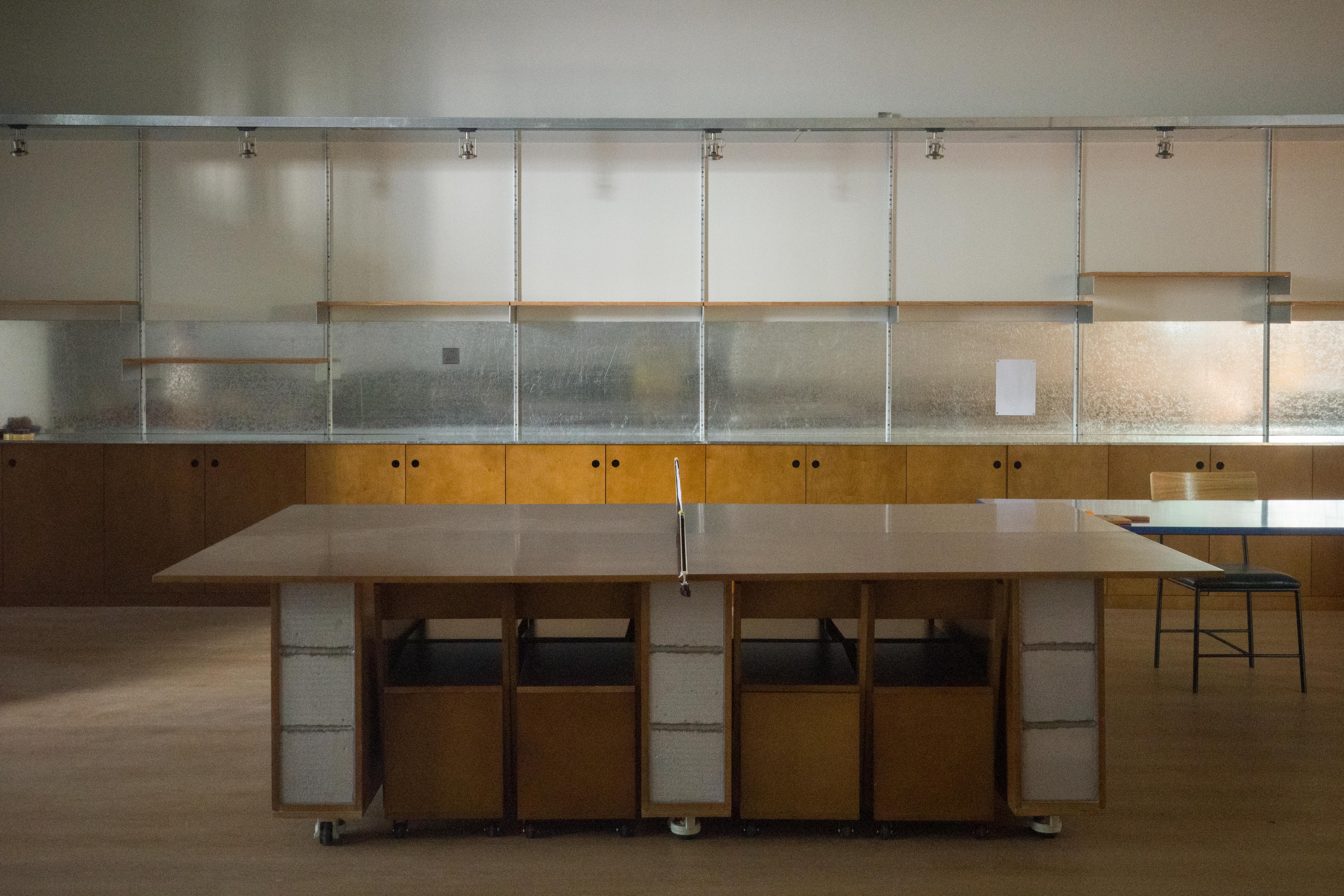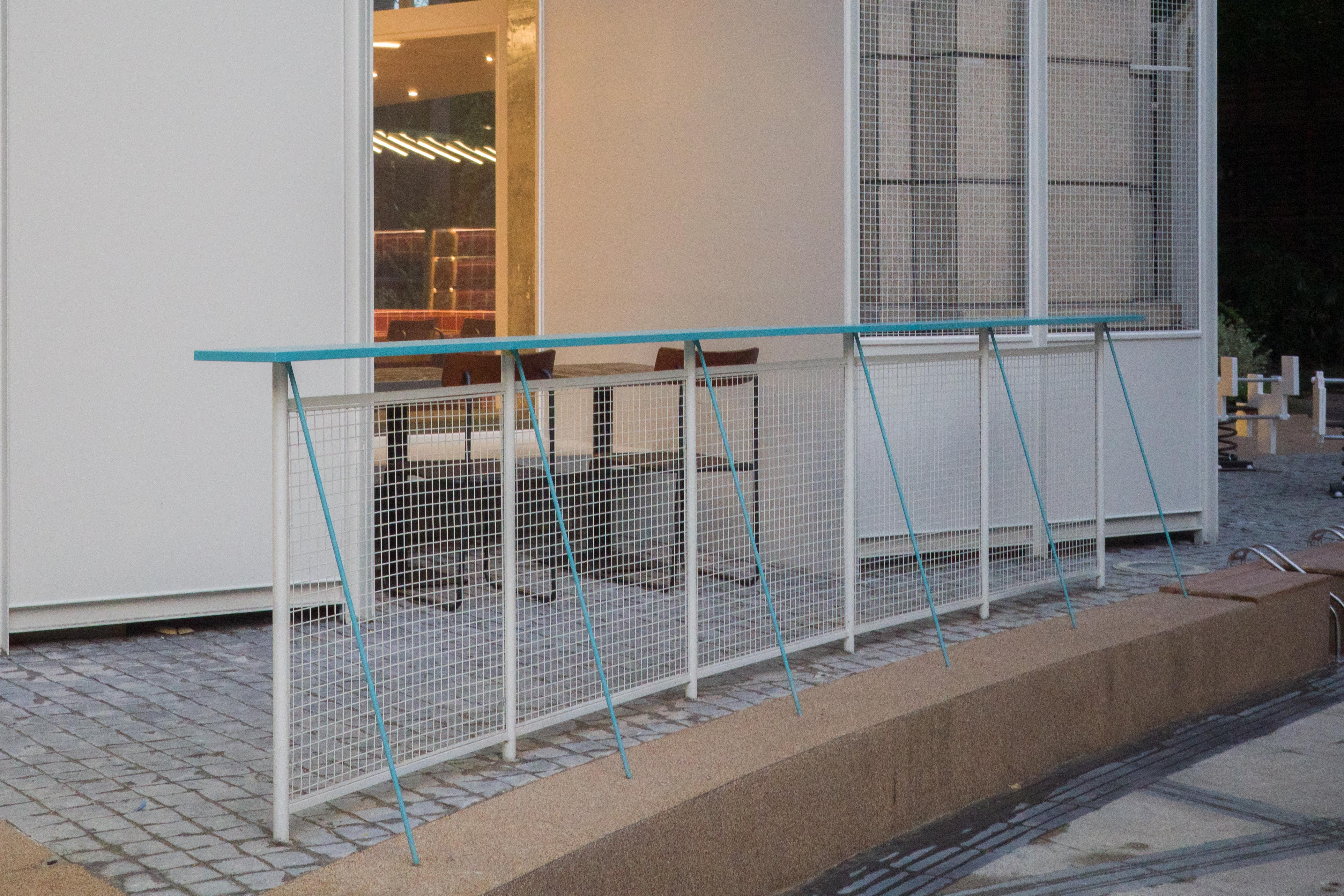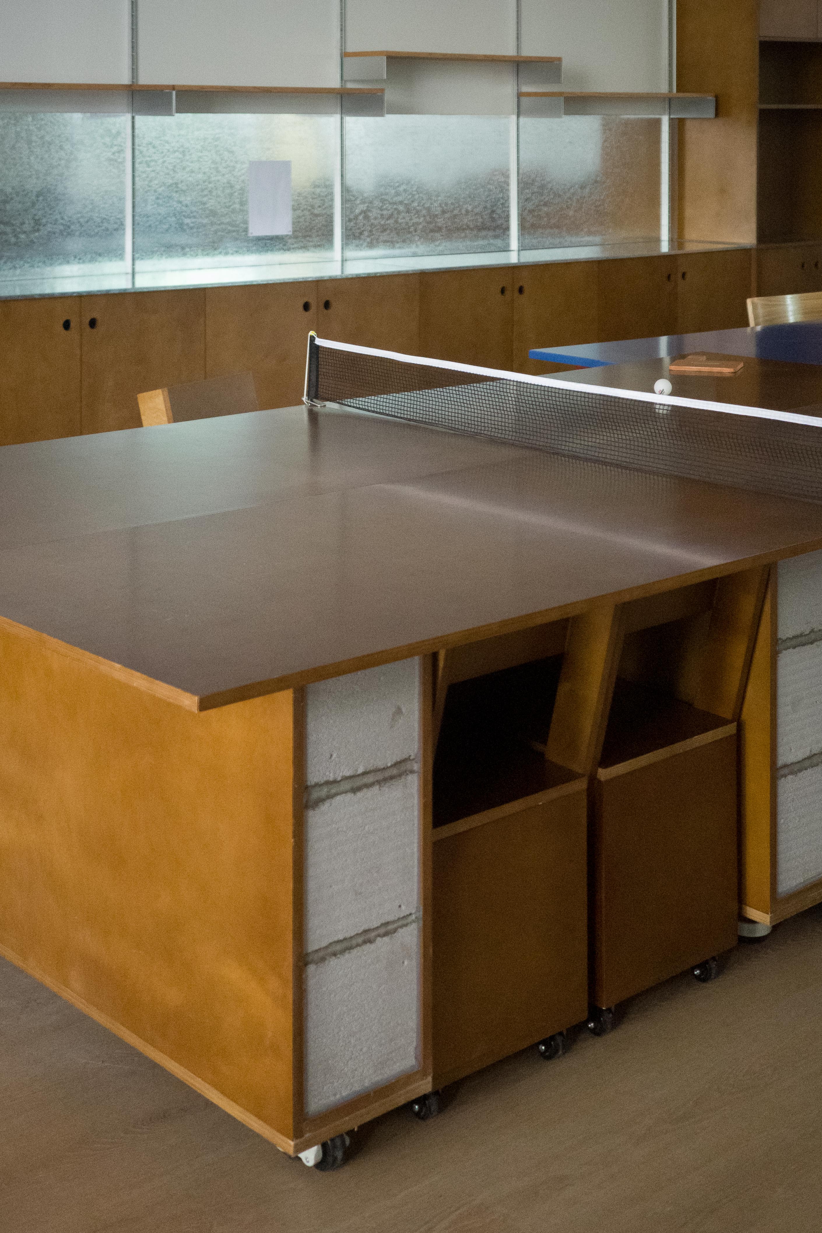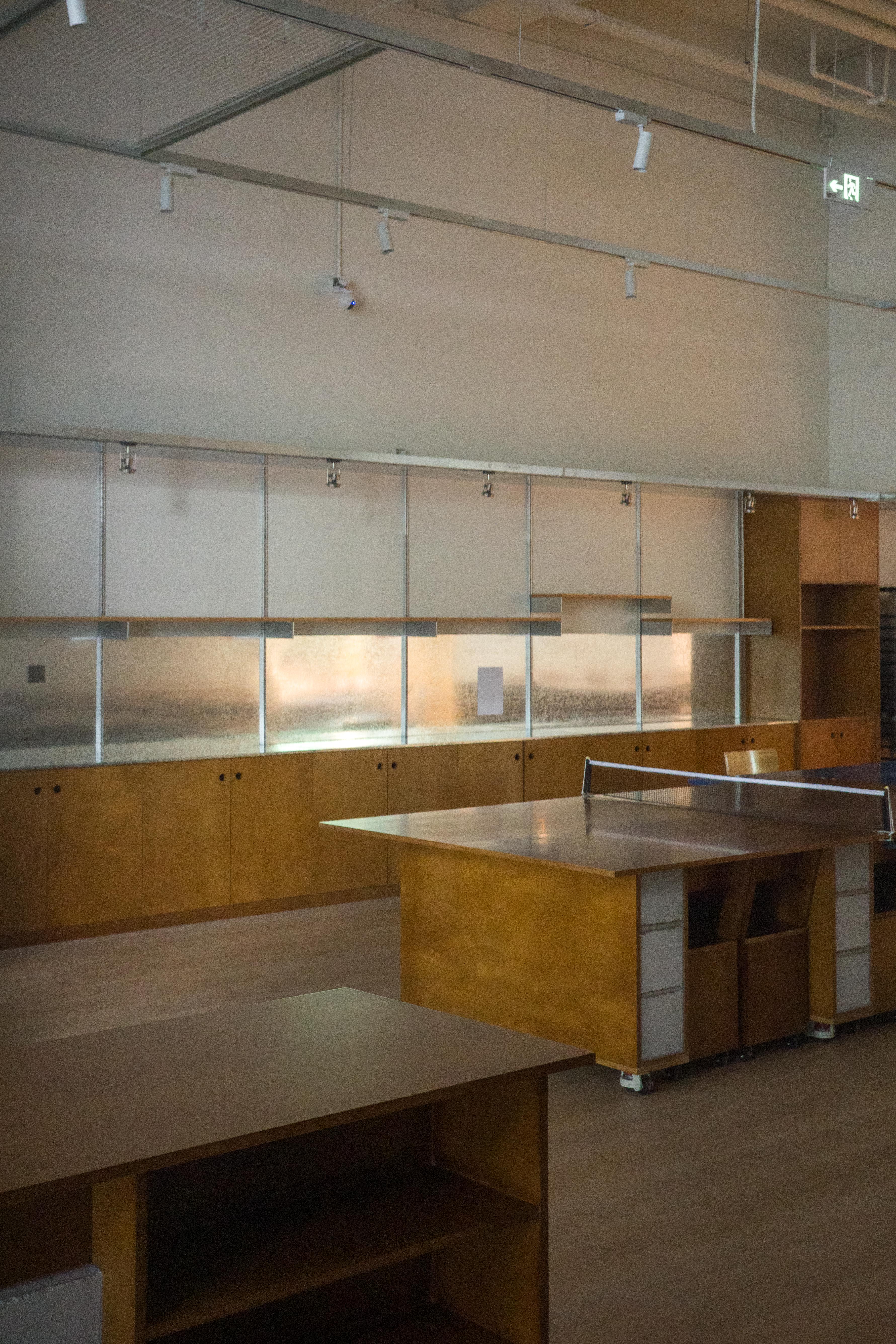 材料的使用延续了一门社一贯的日常取向——砌块砖的堆砌、裸露水泥的原始质感,以及瓷砖细节的朴实表达,都来自我们熟悉的街头语言。空间以五张岛台桌为核心展开:入口处,一张贯穿立面的长桌自然地将室内外连接起来;面包柜前的展示台镶嵌着盘子、杯子与碗的形状,像是生活痕迹的延伸;吧台侧的小岛台提供自助服务;再往里,是一张可用于聚会与办公的大桌子,架上网子便能变成一张乒乓球桌;最里面的开放式操作岛台连接着内部厨房,让面包制作的过程被看见、被分享。空间中点缀的蓝色与黄色,如同烘焙时跳跃的香气,也让这家“醒食”更像一个 studio——一个让生活与面包一同发酵的地方。